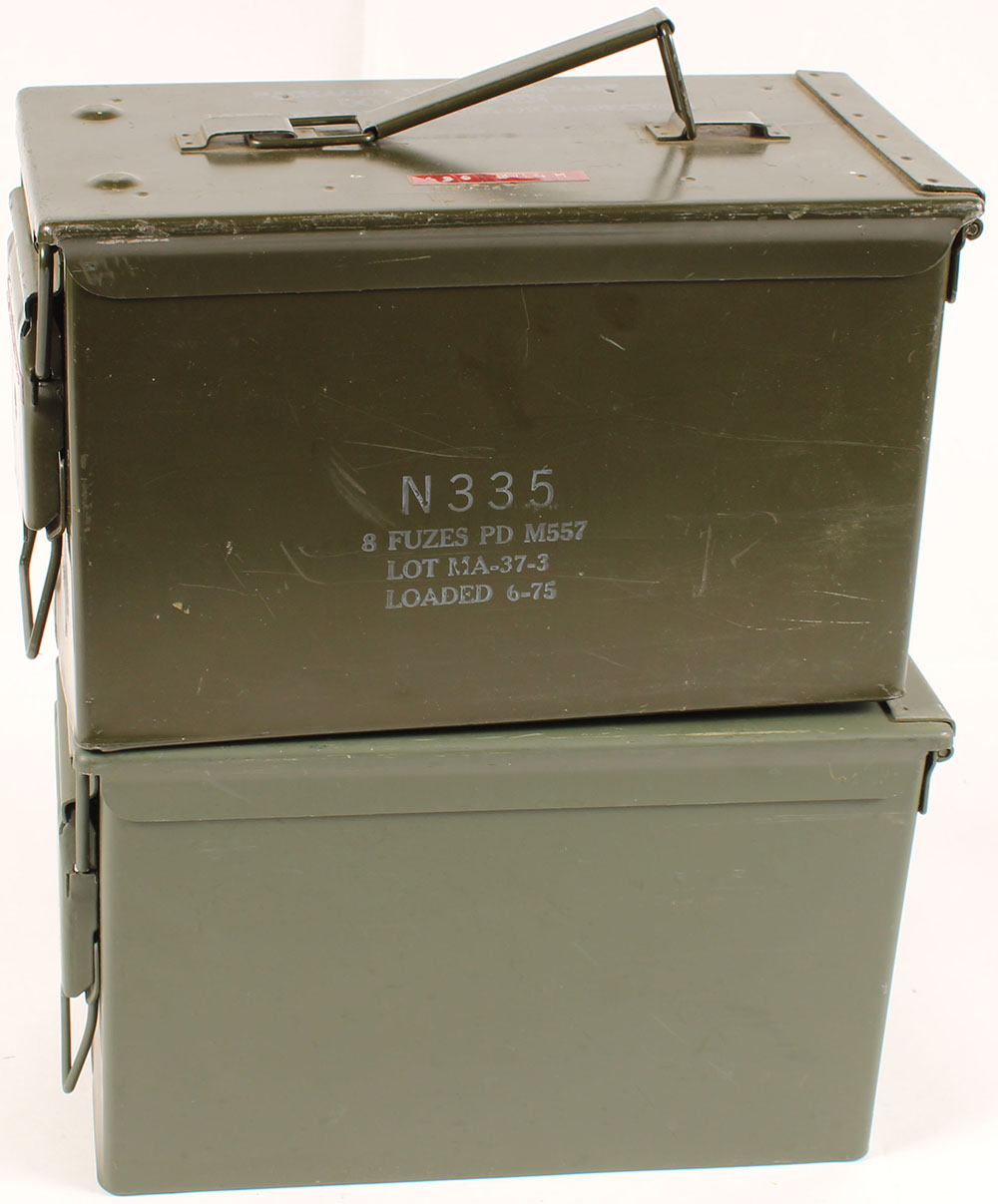 | Lot of two M2A1 .50 Cal metal ammo cans, both empty, insides of ...