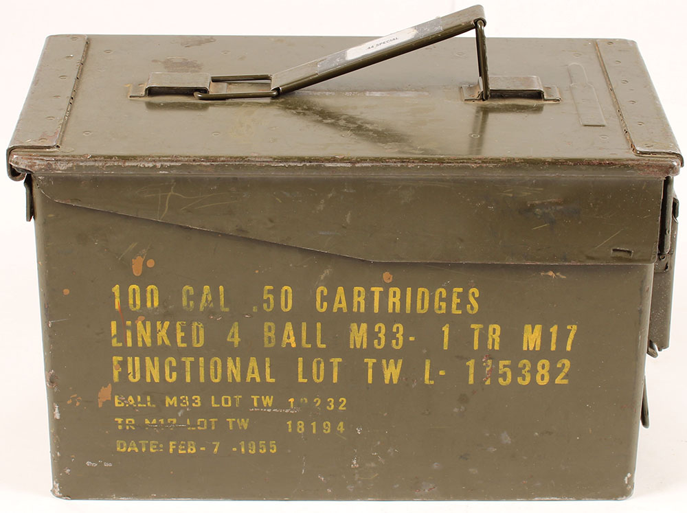 US, M2A1 .50 Cal metal ammo can, empty, inside has some dirt but no rust. Grade: Very Good + - Value: 10 to 30