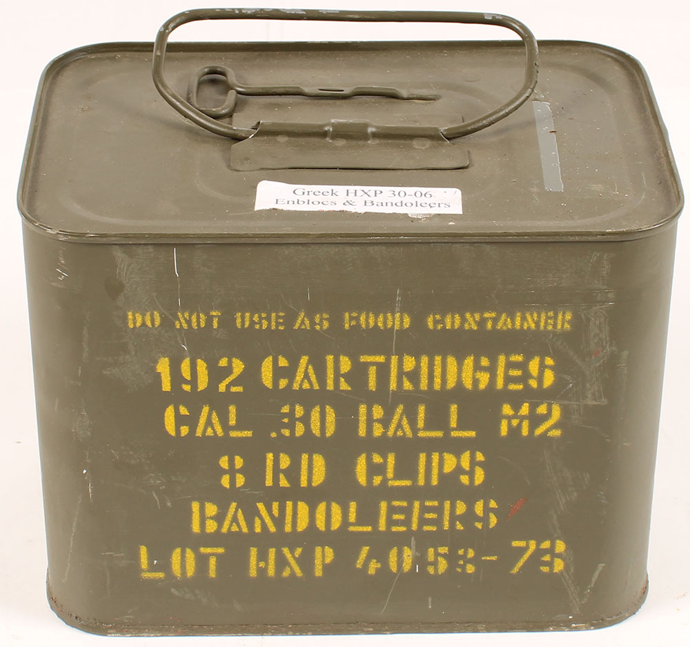 Greek, SEALED spam can, .30-06 M2 Ball, 192 Rds. on 8Rd. Enbloc clips for M1 Garand, in bandoleers, Lot HXP 4053-73. Grade'' Excellent - Value: 200 to 350