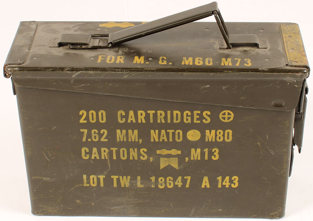 US, M19A1 .30 Cal metal ammo can, filled with 128 Rds. Of Surplus .30-06 M2 Ball, mix MFG & mix year of MFG, on 8Rd. Enblock clips for M1 Garand, some ammo corrosive with mix MFG. ammo is Excellent. Grade: Excellent + - Value: 120 to 200