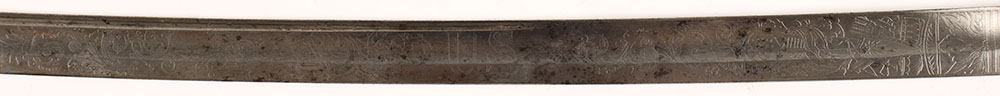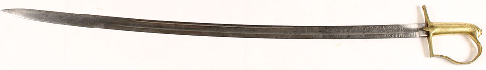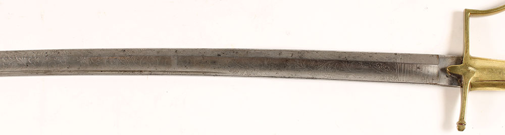 US, W.H. Horstmann & Sons, Naval Marine Officers sword, 1815-1820. Brass handle with spotty patina. Both sides of the blade is acid etched with intricate floral designs, American eagles, ''US'', & other American imagery, the right side of the blade is etched ''W.H.'', ''HORSTMANN'', ''& SONS'', ''PHILADELPHIA''. The spine of the blade is etched ''IRON PROOF''. The blade has a light speckling of dark patina. . Grade: Excellent - Value: 150 to 300