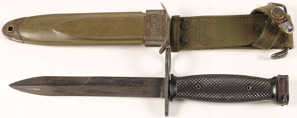 Bauer Ordnance Corp., M7 Bayonet with M8A1 sheath/hanger, checkered black grips, blade has use/sheath wear, top of guard marked ''US M&'', ''BOC''. Grade: Very Good + - Value: 50 to 100