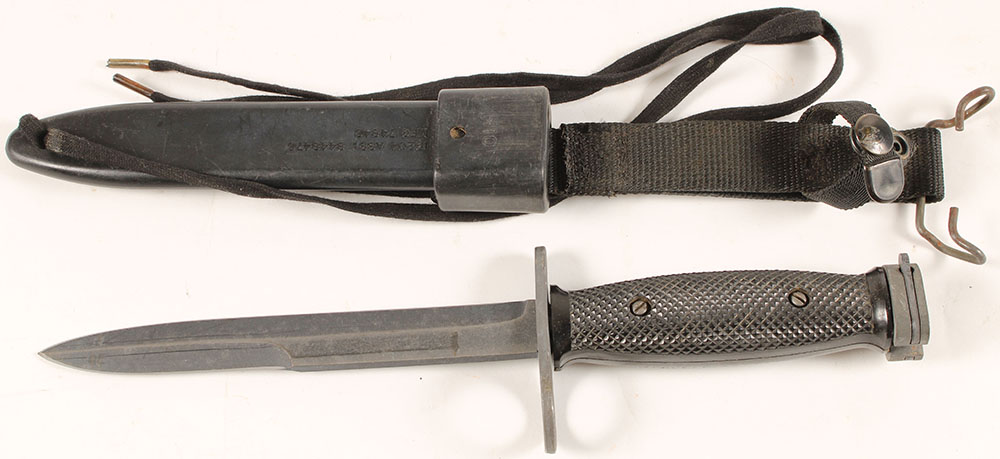 General Cutlery Inc., M7 Bayonet with M10 sheath/hanger, black checkred grips, blade has light use/sheath wear, top of guard marked ''U.S. M7'', ''GEN CUT''. Grade: Excellent - Value: 50 to 100
