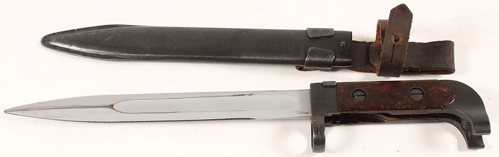 Russian, AK-47 (M1951) bayonet with sheath & hanger, baklite grips, blued guard & pommel, blade has sheath wear, left side of pommel marked 247 & cyrilic ''y4''. Grade: Excellent + - Value: 50 to 100