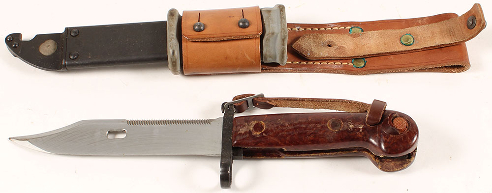 Romanian, AKM type 1 (M1959) bayonet with sheath & frog, Bakelite handle, bare steel blade has light sheath wear, guard marked ''ZG 2978''. Grade: Excellent + - Value: 40 to 80