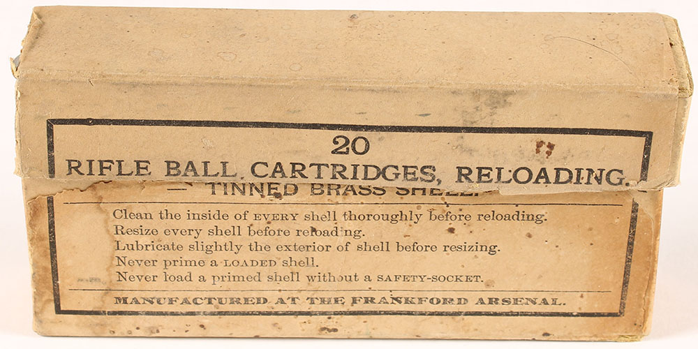 Frankford Arsenal, Rifle Ball Cartridges .45-70 Government, Tinned Brass Shell, Manufactured to be reloaded, Partial 18rds., 92 H/S date, 2pc. Buff box with black printing, box is missing left end of lid, very good color, some staining, minor edge & corner wear, ammo is good to very good. Grade: Very Good - Value: 30 to 60