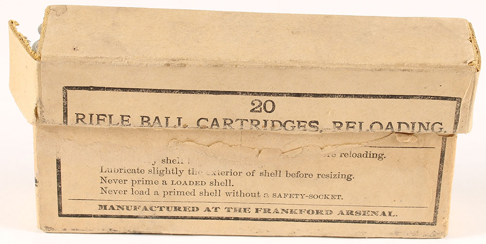 Frankford Arsenal, Rifle Ball Cartridges .45-70 Government, Tinned Brass Shell, Manufactured to be reloaded, Full, 92 H/S date, 2pc. Buff box with black printing, seam splits to left end of lid, very good color, some scuffing on front, some edge & corner wear, ammo is very good. Grade: Very Good + - Value: 30 to 75
