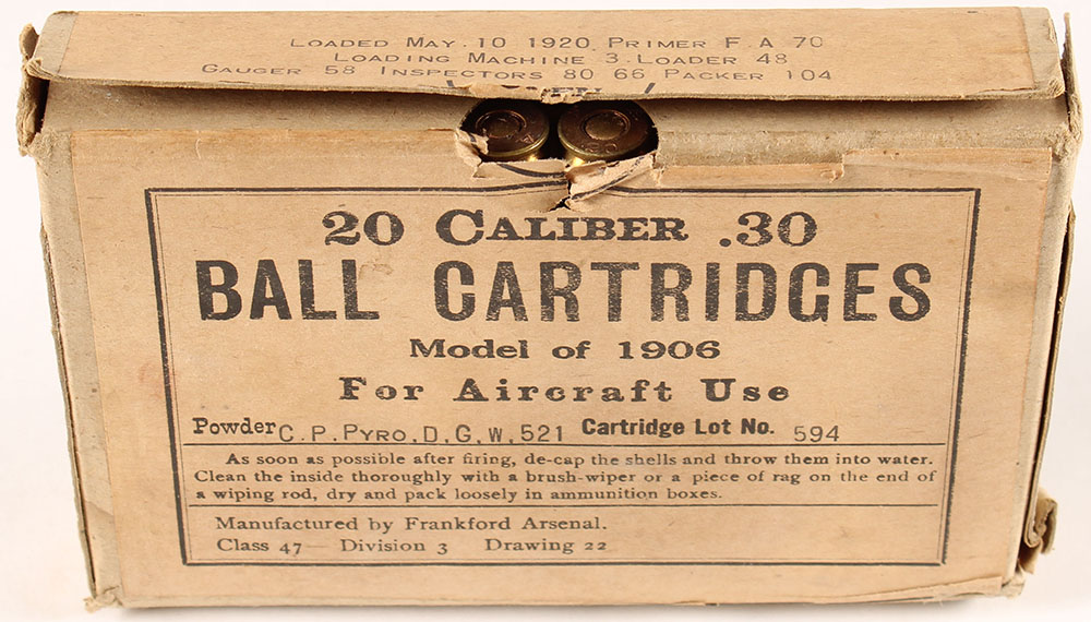 Frankford Arsenal, Ball Cartridges for Aircraft Use, .30 Model of 1906 (.30-06), Cartridge Lot No. 594, Full, 1pc. Buff box with buff label, box is solid with very good to excellent color, minor age soiling, corner wear, some edge wear, top flap is solid, ammo is very good to excellent. Grade: Very Good ++ - Value: 20 to 30