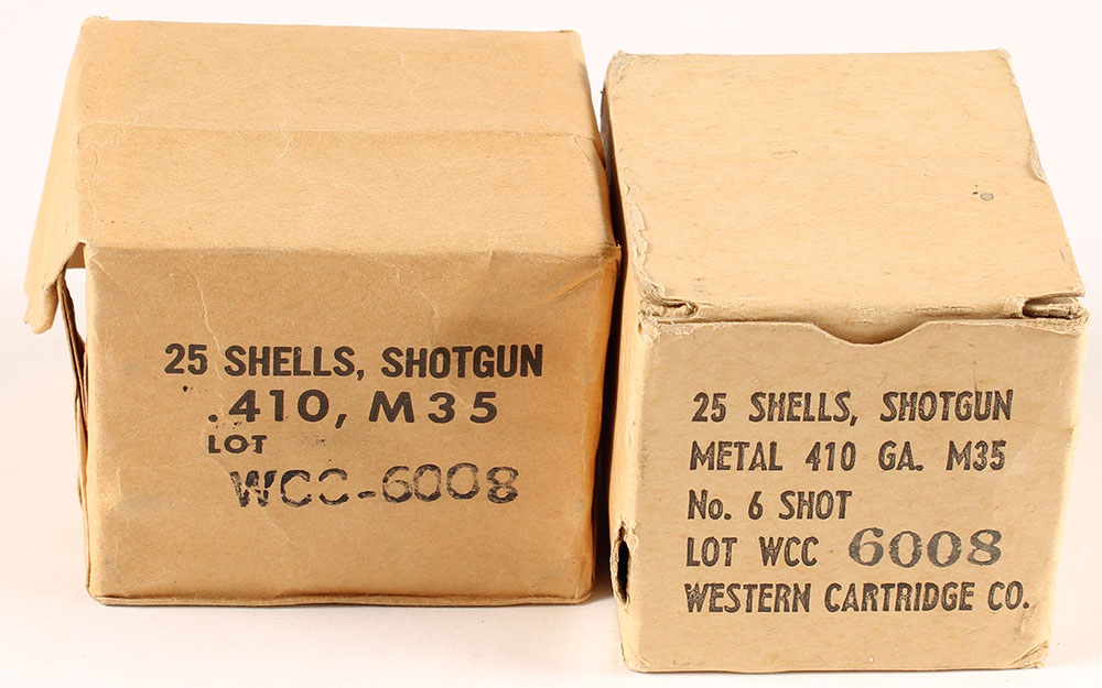 Western, Lot of (2), M35, .410 Ga. Shot Shells, (1) box partial 20rds., (1) box FULL & SEALED, 1pc. Buff boxes with black printing, excellent color, some corner wear, very minor edge wear, full box ammo is excellent. Grade: Excellent - Value: 50 to 75