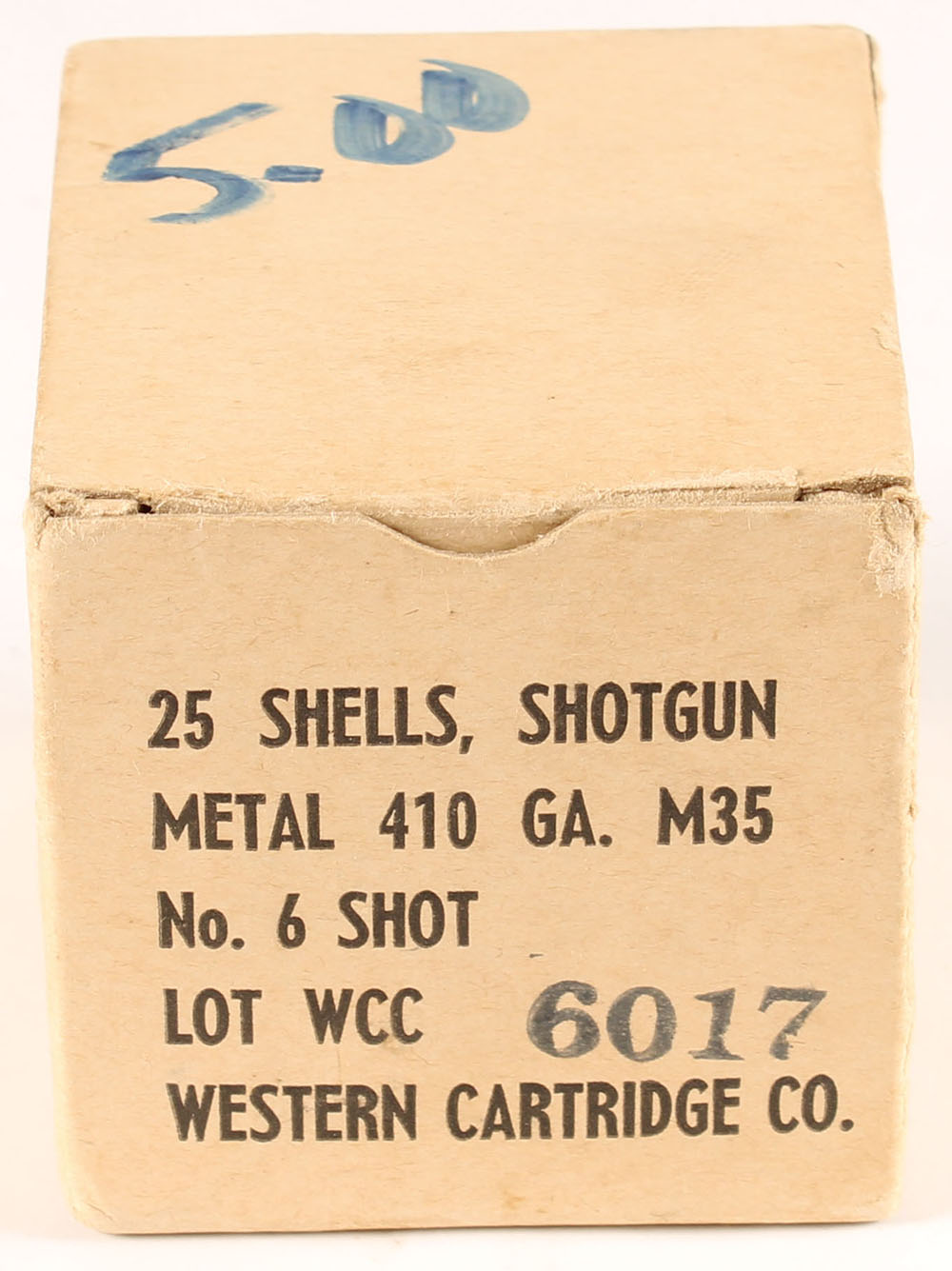 Western, M35, .410 Ga., Metal Shotgun Shells, No. 6 Shot, Full, 1pc. Buff box with black printing, box is solid with excellent color, top has been written on, minor corner wear, edges are mostly crisp, top flap is solid, ammo is excellent. Grade: Very Good ++ - Value: 30 to 45