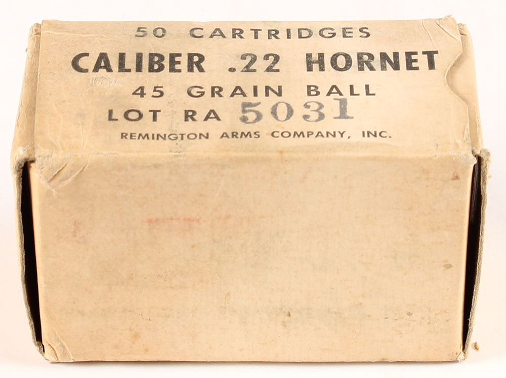 Remington, .22 Hornet, 45 Grain Ball, Lot RA 5031, Full, 1pc. Buff box with black printing, box is solid with very good color, some age soiling & corner wear, minor edge wear, end flaps are solid, ammo is excellent. Grade: Very Good ++ - Value: 36 to 54