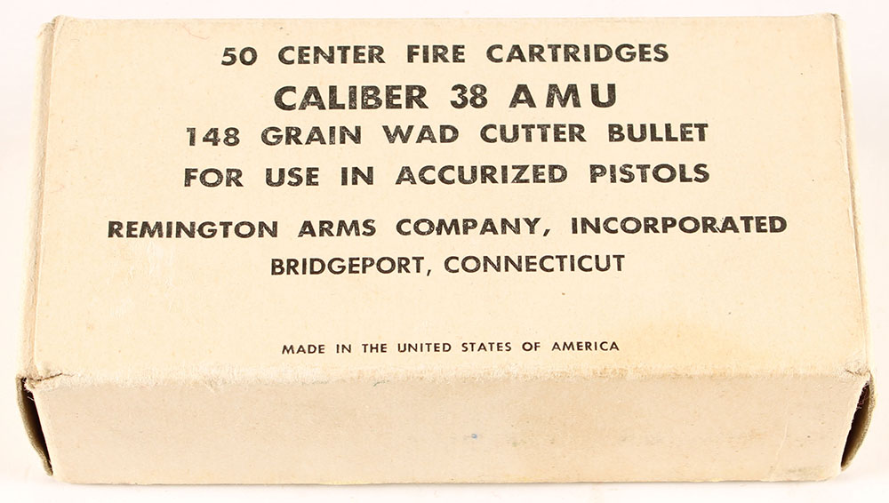 Remington, AMU, .38 Caliber, 148 Grain Wad Cutter Bullet, Full, 1pc. White box with black printing, box is solid with very good to excellent color, very minor age soiling, stain on front, minor edge & corner wear, end flaps are solid, ammo is excellent. Grade: Excellent - Value: 20 to 30