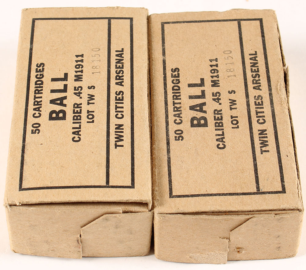 Twin Cities, Lot of (2), Ball, .45 M1911 (.45 Auto.), Lot TW S 18150, (1) box full, (1) box partial 44rds., 1pc. Buff boxes with black printing, boxes are solid with excellent color, some edge & corner wear, top flaps are solid, ammo is very good to excellent. Grade: Excellent - Value: 24 to 36