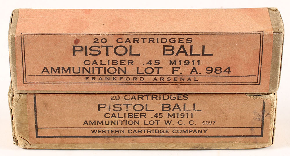 Mixed Mfg., Lot of (2) Pistol Ball M1911, .45 Auto., both boxes FULL & SEALED, 1pc. Buff boxes with red labels, boxes are solid with excellent color, some age soiling & partial seam splits to Western box, labels are intact. Grade: Excellent - Value: 30 to 45