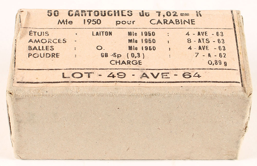 French, 7.62mm K (.30 Carbine), Mle 1950, FULL & SEALED, 1pc. Buff box with cream colored label, box is solid with excellent color, some shelf & corner wear, minor edge wear, label is intact (this ammo is known to have corrosive primers). Grade: Excellent - Value: 16 to 24
