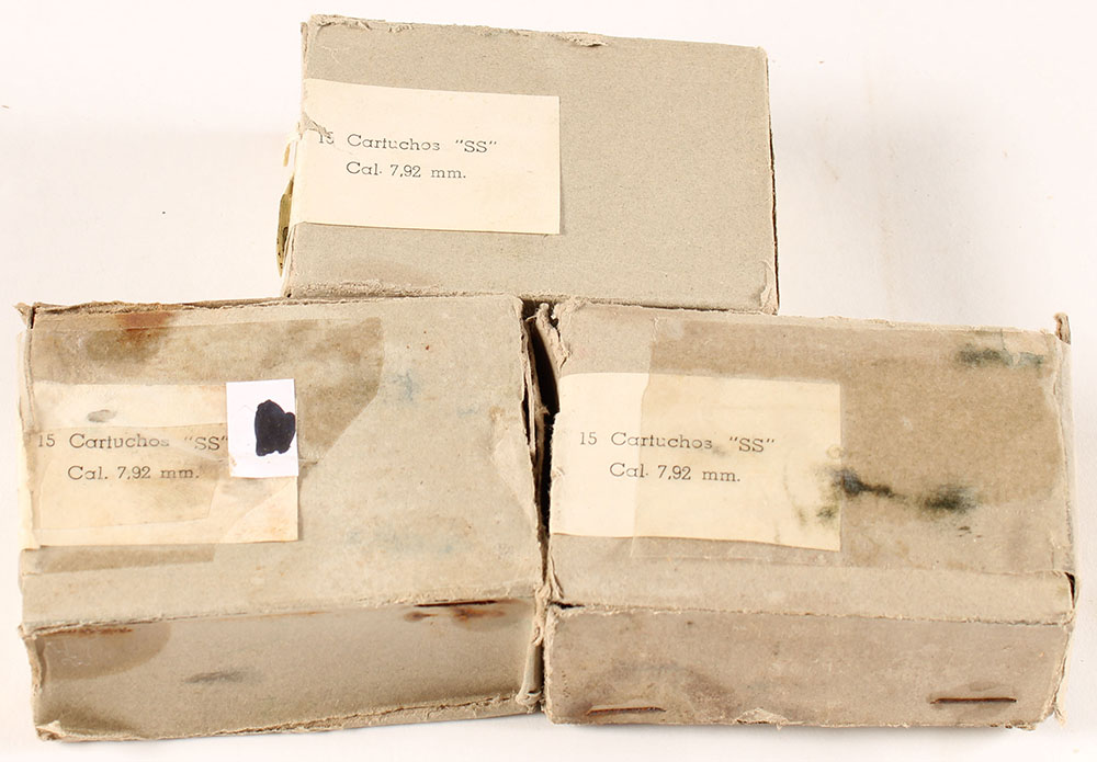 Lot of three Ecuadorian 7.92mm (8mm Mauser), boxes are full and have tape on ends, age soiling, edge & corner wear, ammo is excellent. Grade: Very Good - Value: 24 to 36