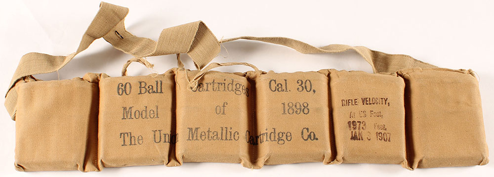 US, UMC, 6 pouch Bandoleer, .30-40 Krag, 60 Rds. total, dated Jan 3 1907, four of the pouched are still sown shut while two open. The front of the bandoleer is marked ''60 Ball Cartridges Cal..30,'', ''Model of 1898'', ''THE UNION METALLIC CARTRIDGE CO.'', ''RIFLE VELOCITY'', ''At 53 Ft.'', ''1973 Feet'', ''Jan 3 1907''. Ammo in open pouches are excellent. Grade: Excellent ++ - Value: 80 to 160
