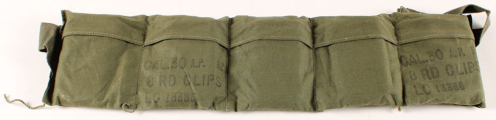 US, Lake City, 6 pouch bandoleer, 40 total Rds. Of .30-06 AP M2 Ball On 8 Rds. Enbloc clips, bandoleer lot ''LC 13386'', ammo is lake city 1953 dated, this is right when they switched to non-corrosive primers, ammo might be corrosive. Ammo is excellent. Grade: Excellent + - Value: 60 to 180