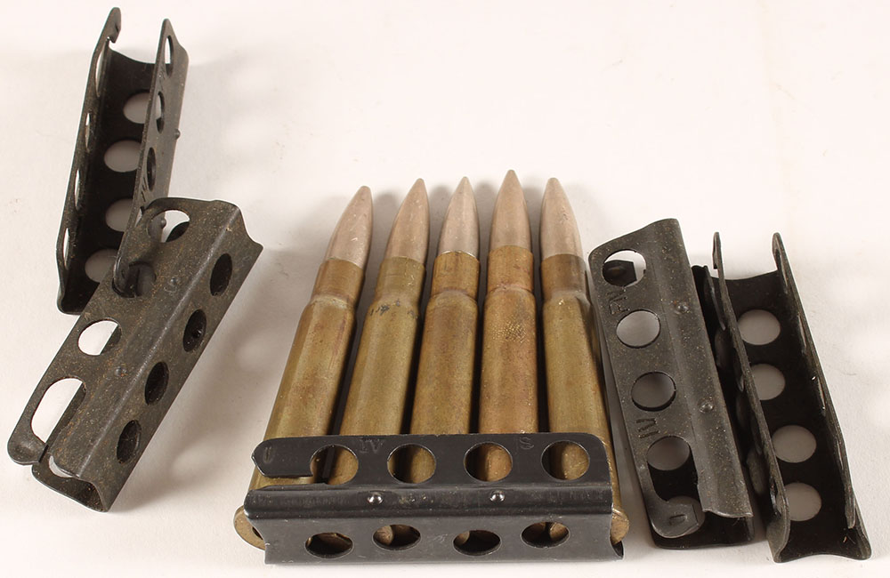 Lot of five .303 Britsh SMLE clips, comes with 5 Rds. Of WW2 britsh surplus .303 Britsh, ammo is very good. Grade: Excellent - Value: 10 to 30