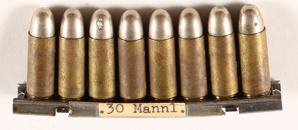 Austrian, 8 Rd. Clip of 7.63mm Mannlicher, for the Mannlicher self-loading pistols, ammo is ranged from good to very good. Grade: Very Good + - Value: 10 to 20