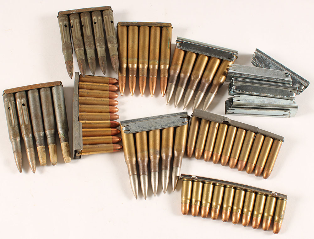 Large lot of Misc military calibers on clips, mix of live ammo & dummies, ammo ranges from very good to good. Grade: Very Good + - Value: 20 to 80
