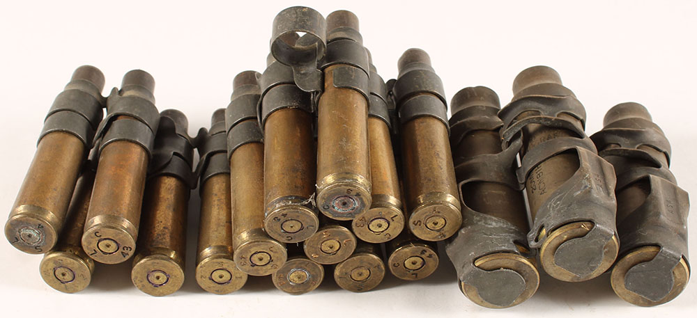 large lot of linked fired military cases, .50 BMG, & electronically fired 20mm. Grade: Very Good + - Value: 6 to 20