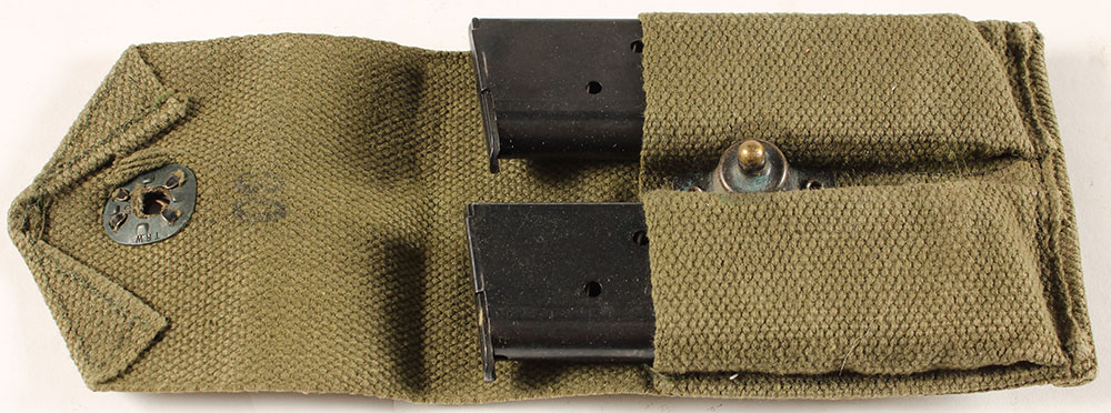 US, two cell M1911 mag pouche, uses ALIC clips, comes with two 7 Rd. .45 M1911 mags, information on back is coplety worn away. Grade: Good ++ - Value: 20 to 40