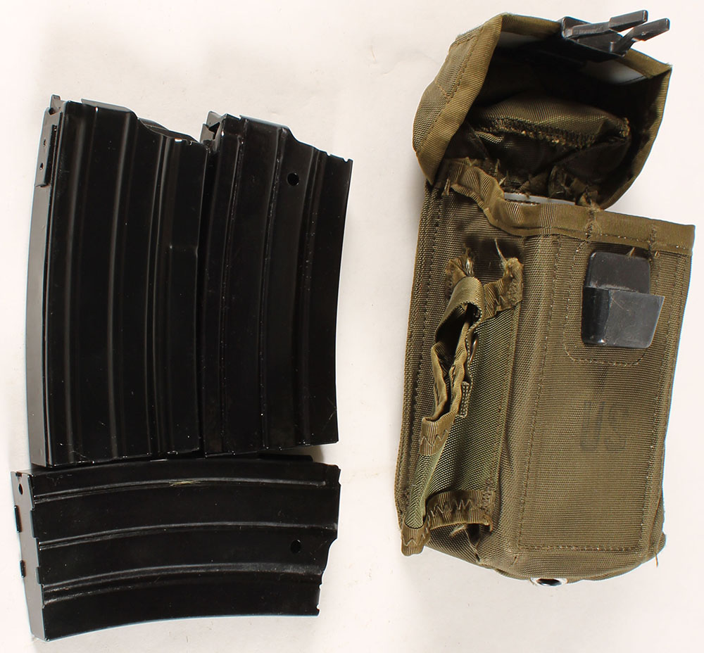 US, LC1 Alice, M16 mag pouch, Nylon, can hold three 30 Rd. M16 Mags, has two pouch's on the sides for grenades, comes with three 20 Rd. Ruger Mini-14 mags. Grade: Excellent - Value: 30 to 60