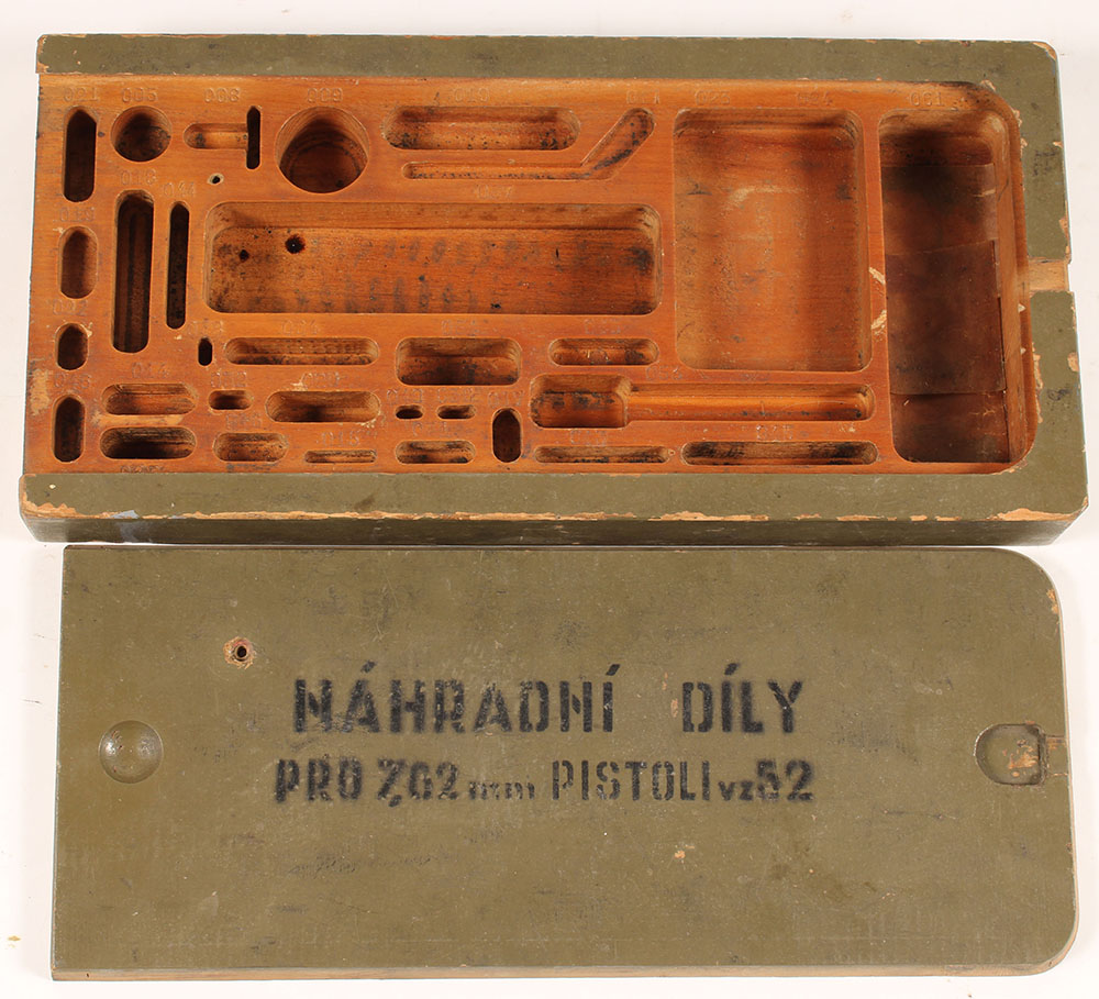 Czech, Vz. 52 pistol Armorer's Kit/ Spare parts kit, empty, has slots for every part of the pistol, these would have been sent to armors to repair pistols, the Czech on the top translates to ''SPARE PARTS'', ''FOR PISTOL VZ52''. Grade: Very Good + - Value: 20 to 100