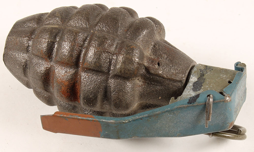 US, Mk2 Pineapple demilled training grenade, has blue spoon with red tip, light corrosion on fuse head, light rust on body. Body marked ''R F X''. Grade: Very Good - Value: 30 to 90