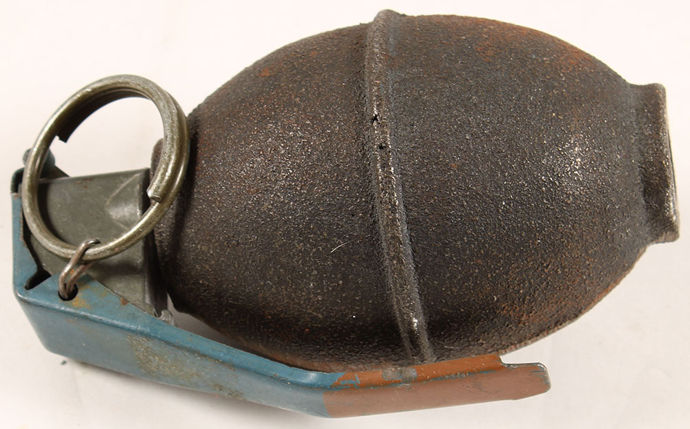 US, M26 ''Lemon'' demilled training grenade, blue spoon with red tip, fuze head & spoon have light corrosion & light rust. Body has scuff marks & light rust. Grade: Very Good + - Value: 30 to 90
