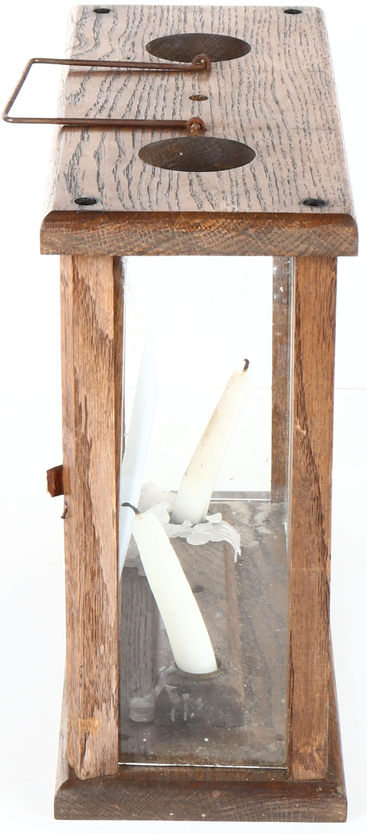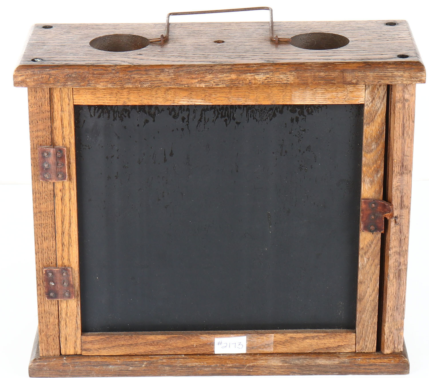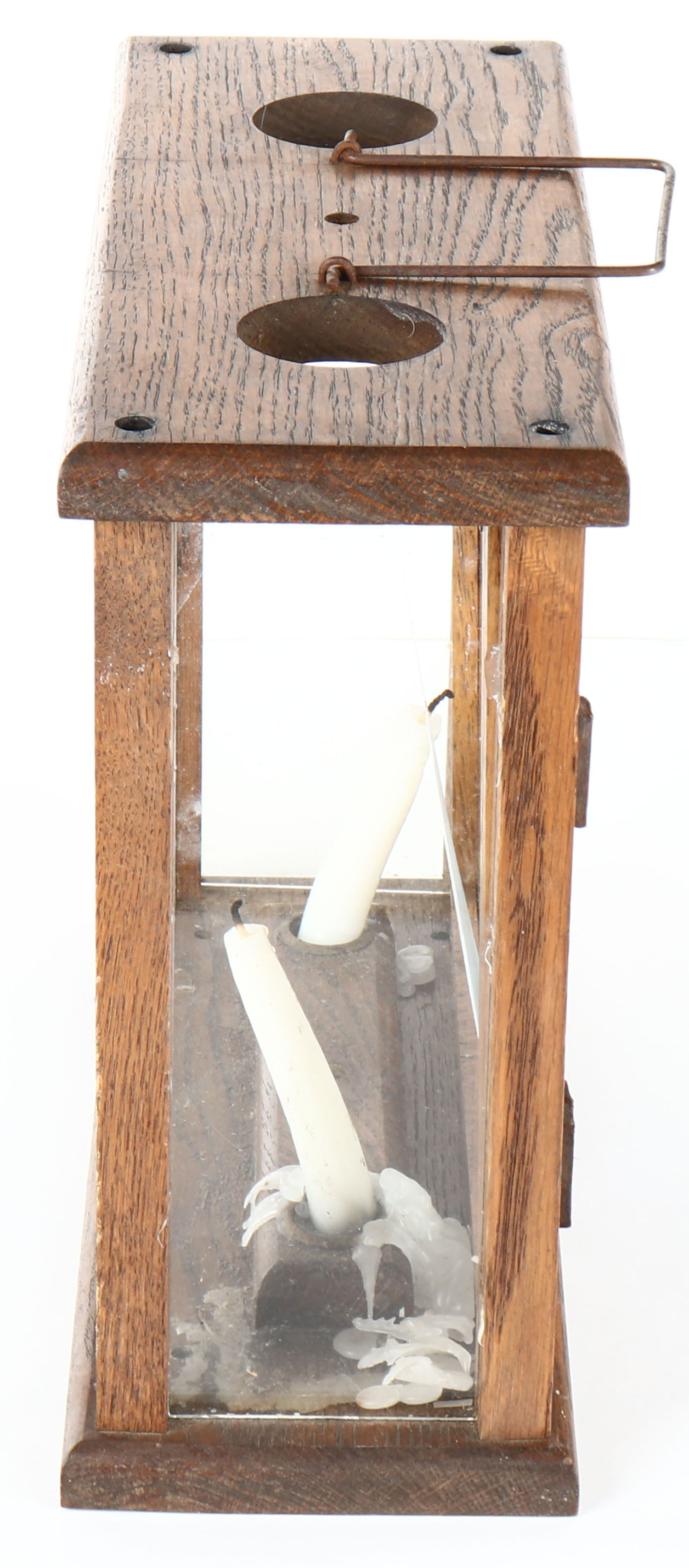 1860's Chesapeake Bay Gunning Light, used by Market Hunters to hunt waterfowl, outlawed in 1872 but the pracitce continued until the early 1900's, the mirrored back is hinged to open, has two candles for light & has two large holes at teh top for heat, made of oak & glass, 14'' x 12'' x 6'', has wire handle at top. Grade: Excellent - Value: 400 to 800