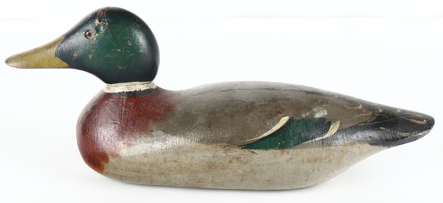 Standard Mallard Drake by Mason Decoy Company, Detroit, MI, 1896-1924. Glass eyes, solid wood, strong all original paint, structurally excellent. Grade: Very Good ++ - Value: 60 to 125