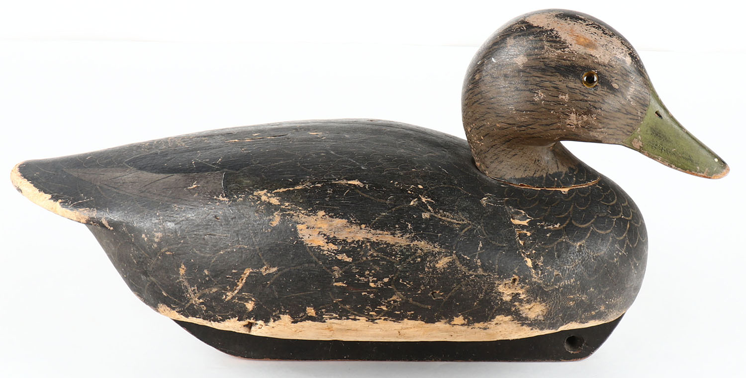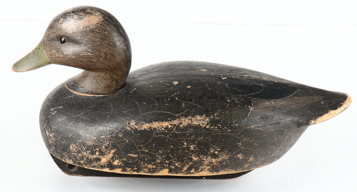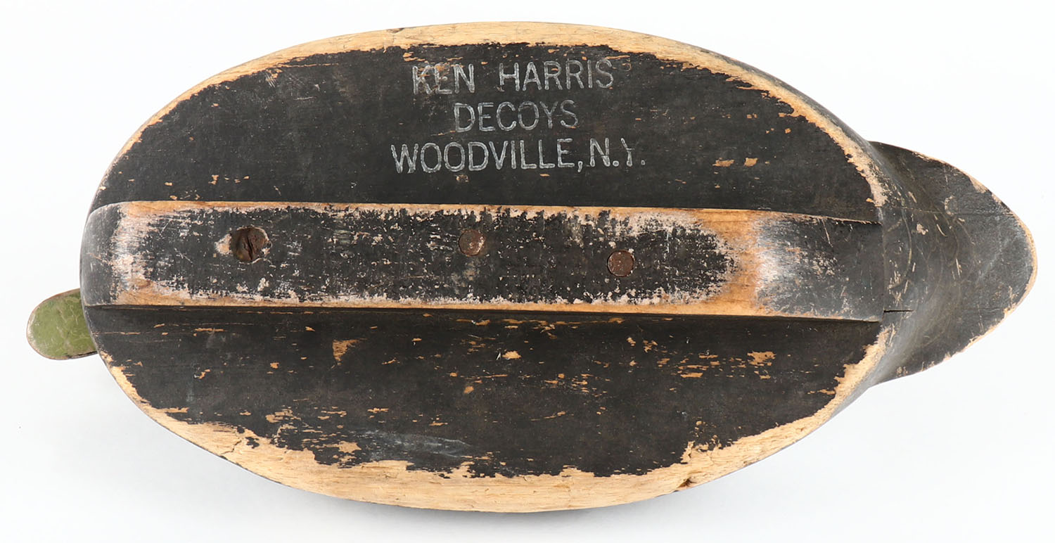 Black Duck by Ken Harris, NY, glass eyes, structurally excellent, solid wood, well marked on bottom, original paint sow wear spots. Grade: Very Good - Value: 40 to 100