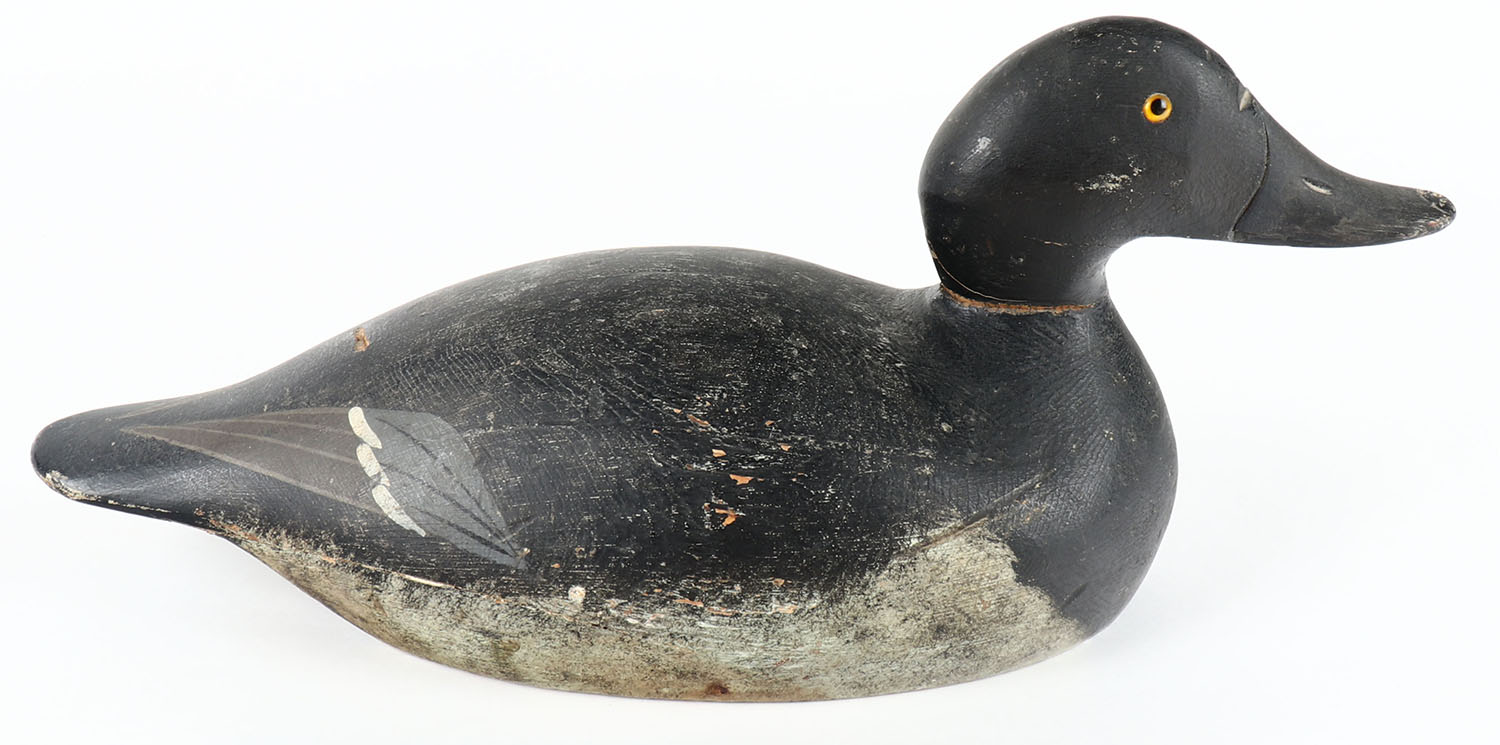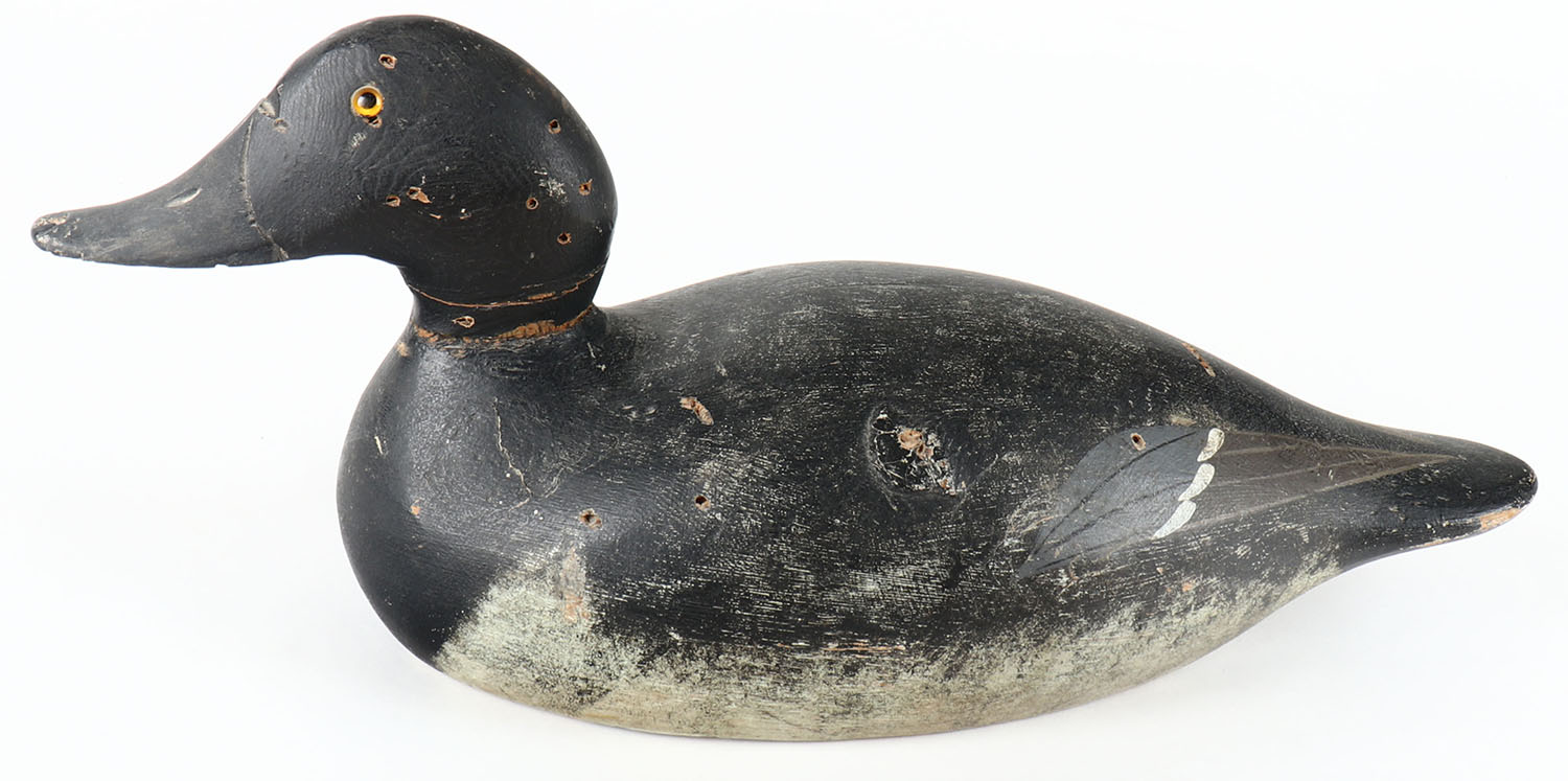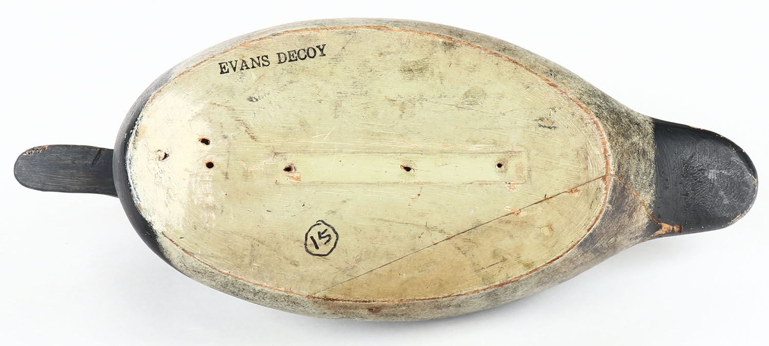 Bluebill Drake by Evans Decoy Company, Ladysmith, WI, 1921-1932, glass eyes, solid wood, original paint has hairline crack in neck & some bird shot, stamped on bottom. Grade: Very Good - Value: 40 to 350