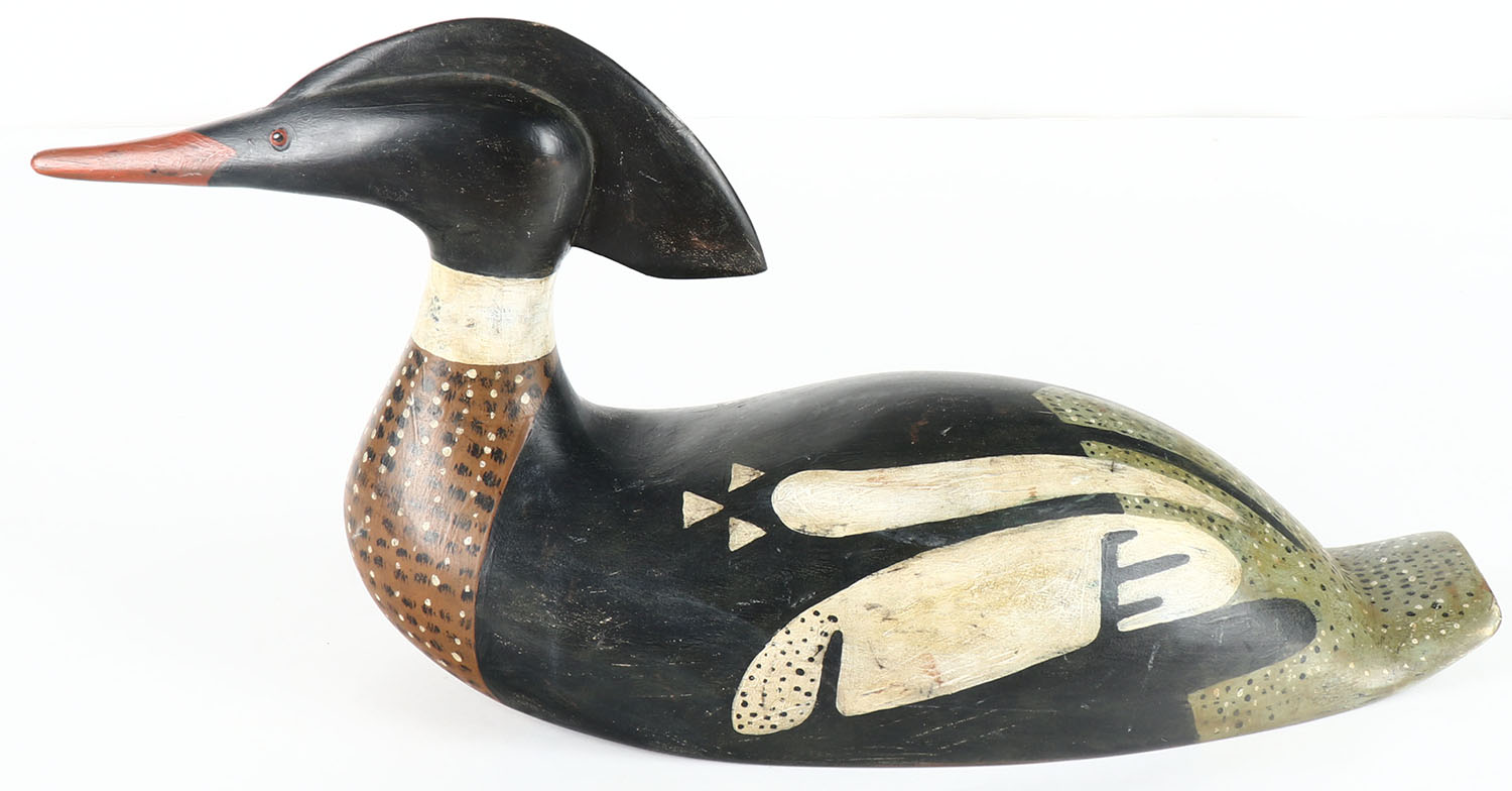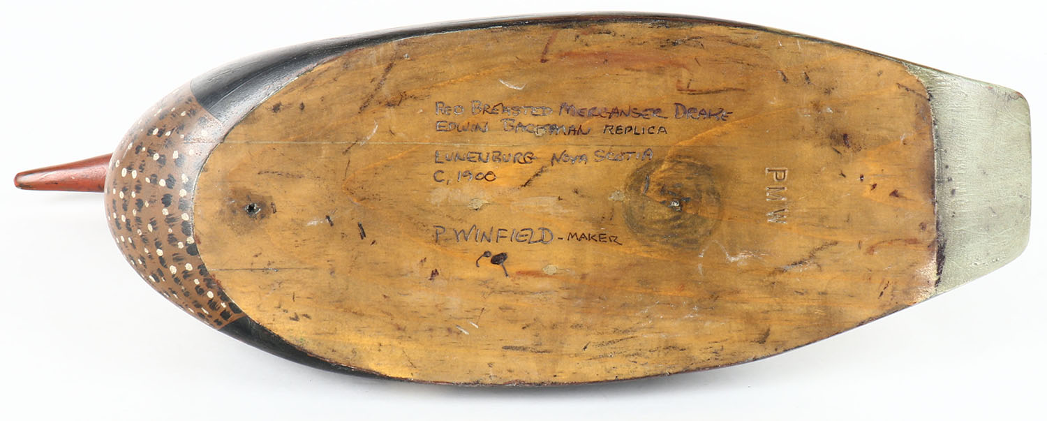 Red Breasted Merganser Drake by P. Winfield, Lunenburg, Nova Scotia, in the style of Edwin Blackman, c1900, PE, solid wood, original paint, branded on bottom PMW, 20'' OAL. Grade: Excellent - Value: 100 to 400