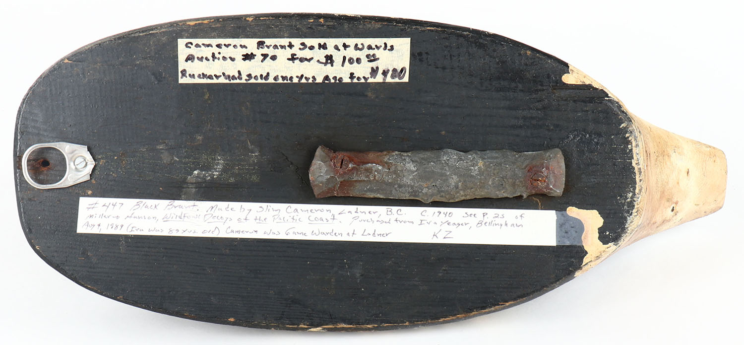 Pacific Brant made by Slim Cameron, Ladner, BC Canada, no eyes, 2-piece hollow red cedar, structurally excellent, excellent original paint, ex-collection of Ira Yeager, Bellingham WA. Grade: Excellent - Value: 100 to 800