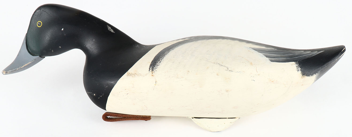 Swimming Bluebill Drake by Dan Carson, Haver de Grace, MD, c1990, PE, solid wood, original paint, structurally excellent, signed on bottom, 16 1/2'' OAL. Grade: Excellent - Value: 100 to 300