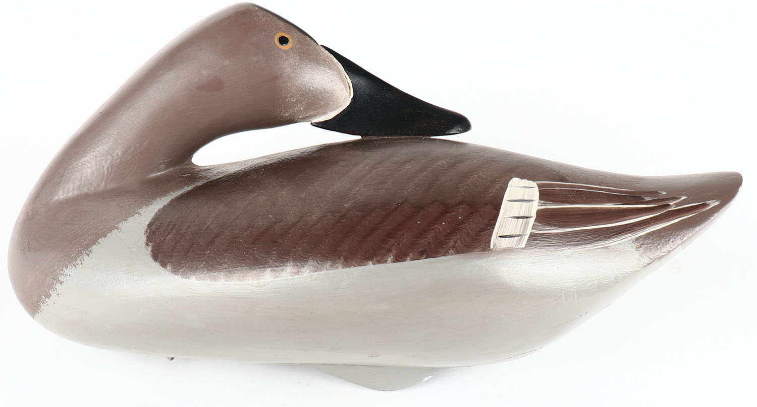 Preening Canvasback Hen by David Walker, MD, painted eyes, solid wood, original paint, structurally excellent, branded on bottom ''WALKER'', 13''. Grade: Excellent - Value: 30 to 60