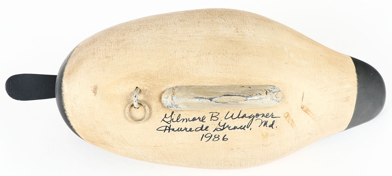 Canvasback Drake by Gilmore B. Wagoner, Havre De Grace, MD, painted eyes, solid wood, original paint, structurally excellent, signed on bottom, 16'' OAL. Grade: Excellent + - Value: 50 to 100
