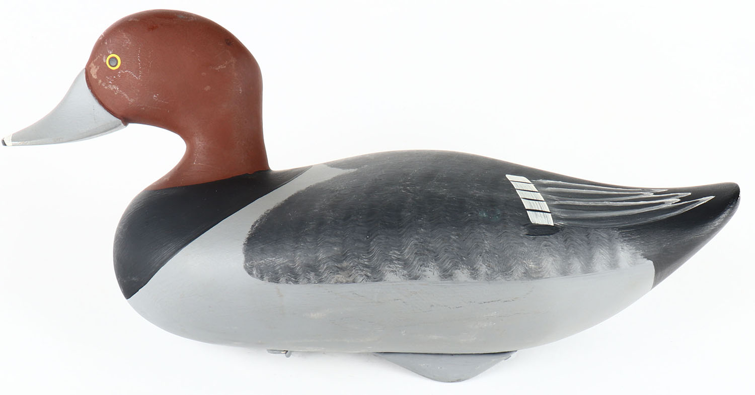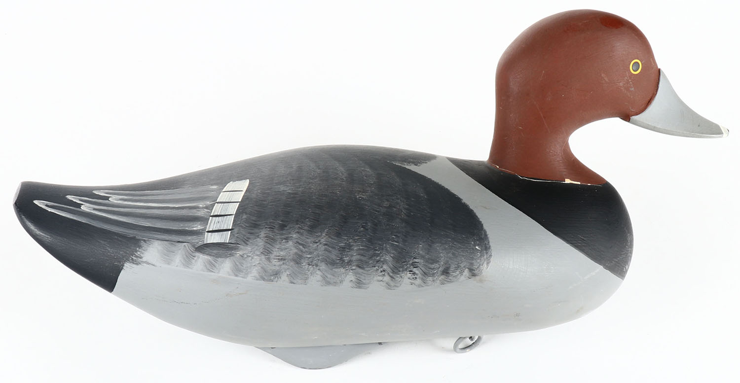 Redhead Drake by Steven R Lay, Havre de Grace, MD, PE, solid wood, original paint, signed on bottom, 15'' OAL. Grade: Excellent + - Value: 40 to 80