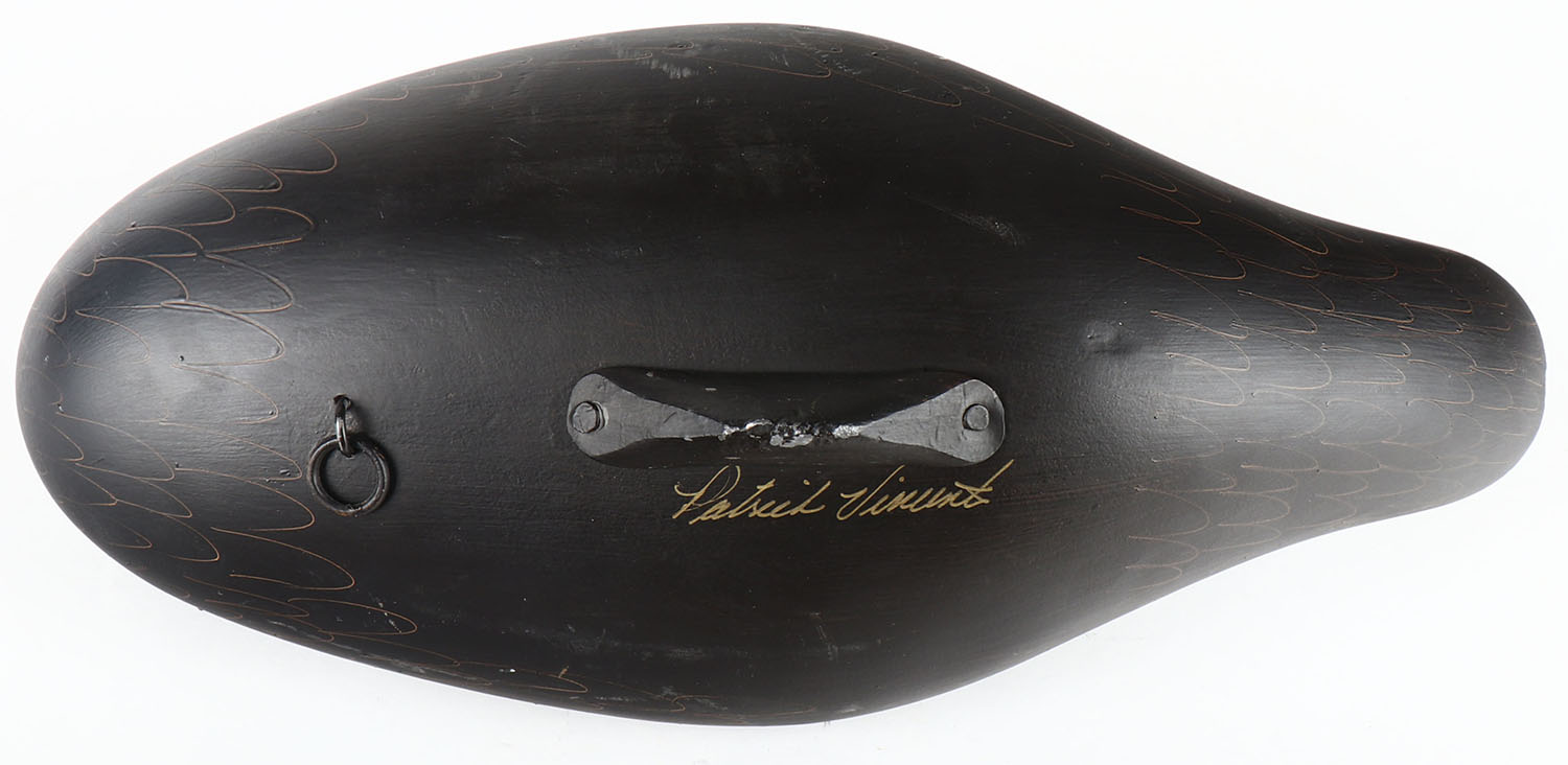 Preening Black Duck by Patrick ''Pat'' Vincent, Churchville, MD, painted eyes, solid wood, original paint, structurally excellent, signed on bottom, 14'' OAL. Grade: Excellent ++ - Value: 40 to 80