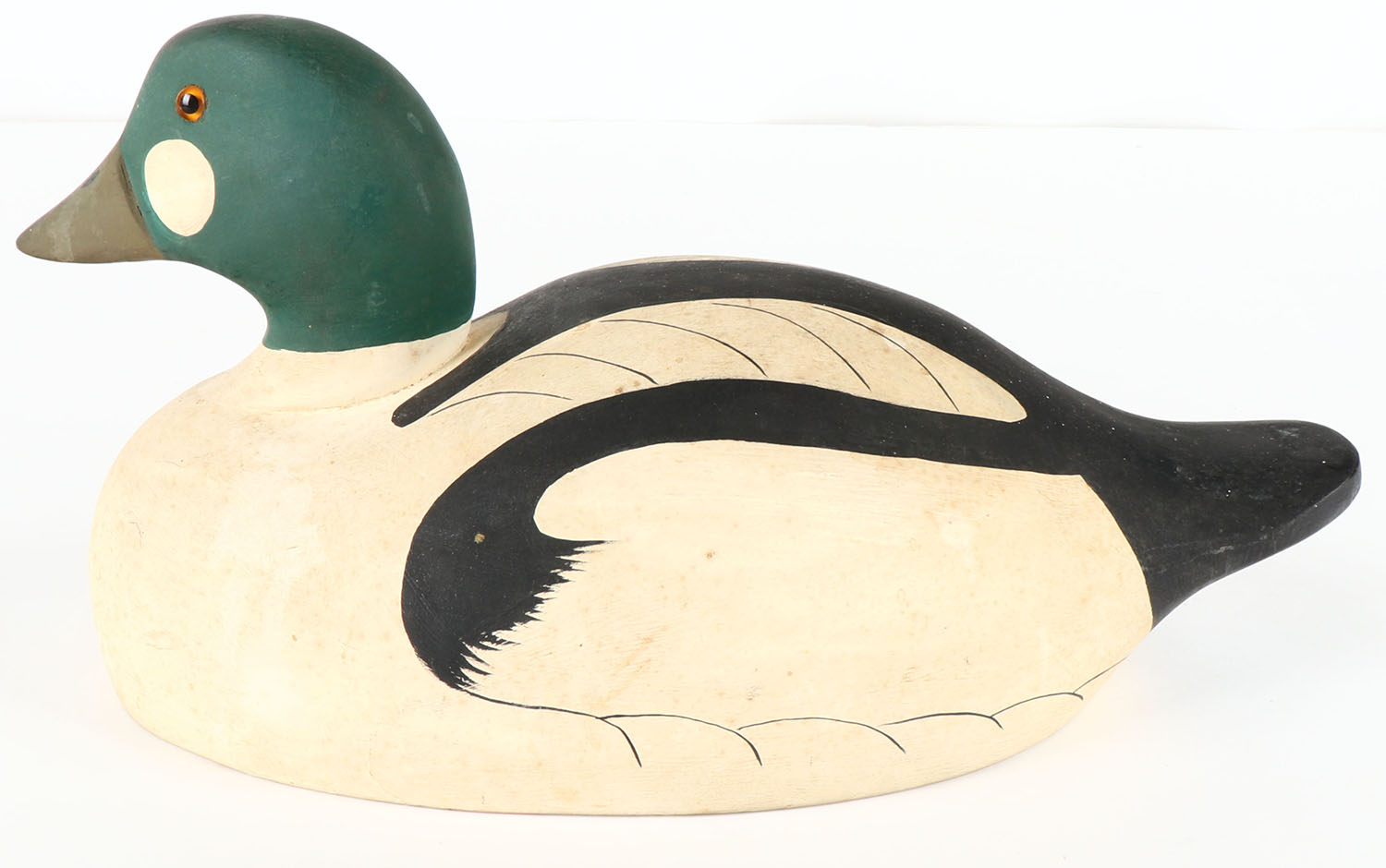 Goldeneye Drake by Glen Burnie, Stoney Point Decoys, MD, glass eyes, solid wood, original paint, structurally excellent, stamped on bottom. Grade: Excellent + - Value: 20 to 40