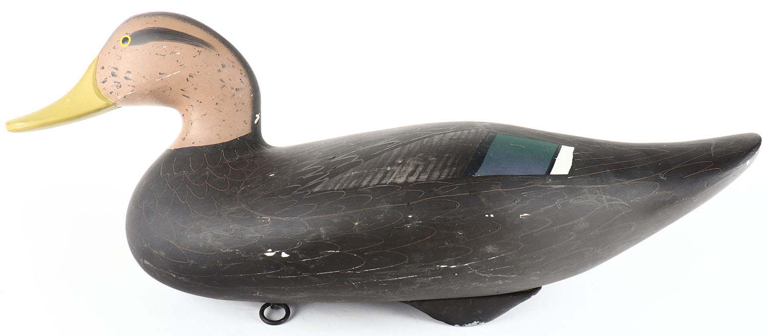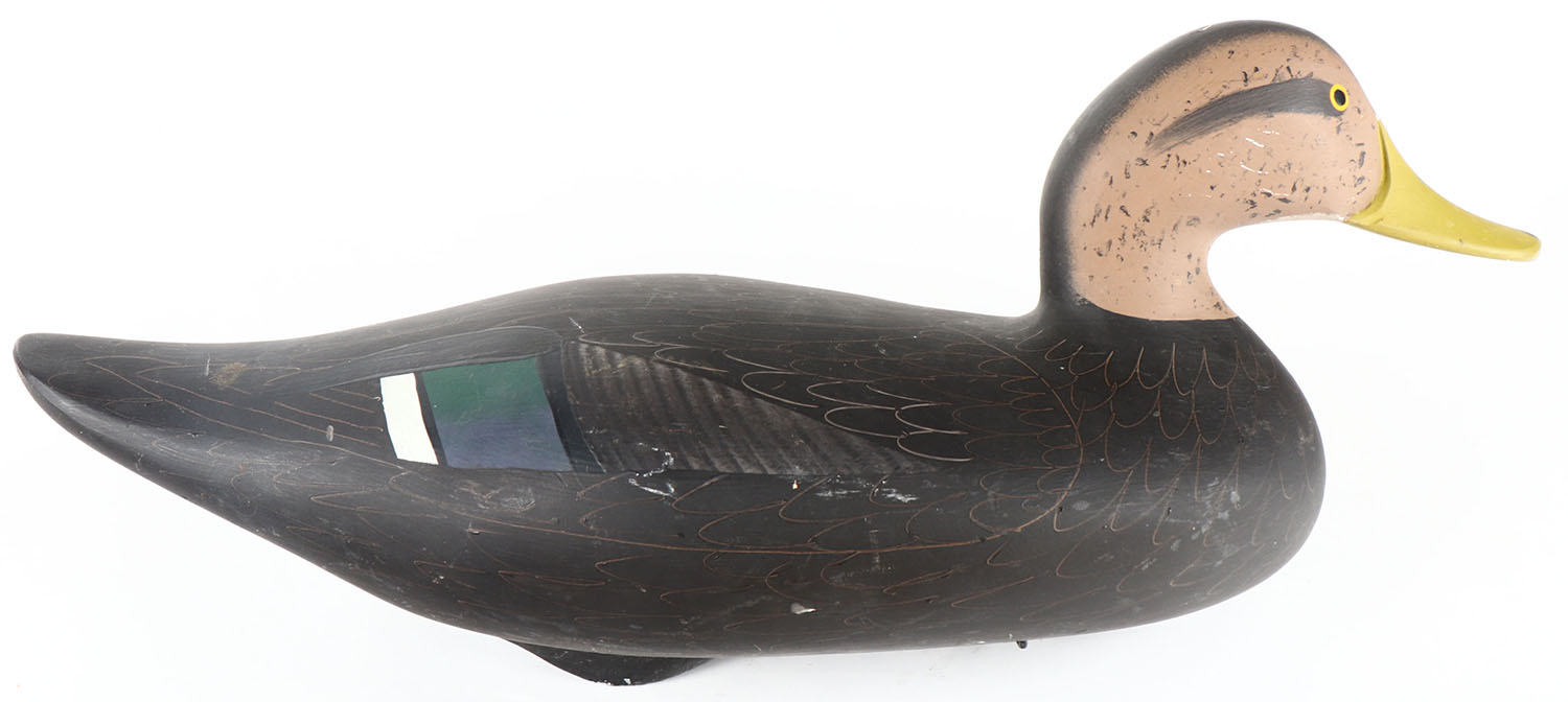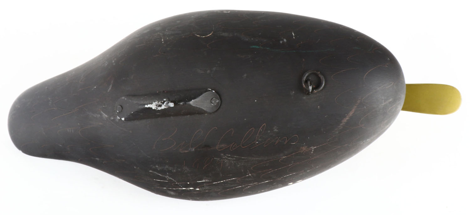 Black Duck by Bill Collins Perryville, MD, PE, solid wood, excellent original paint, signed on bottom, 17'' OAL. Grade: Excellent + - Value: 50 to 150
