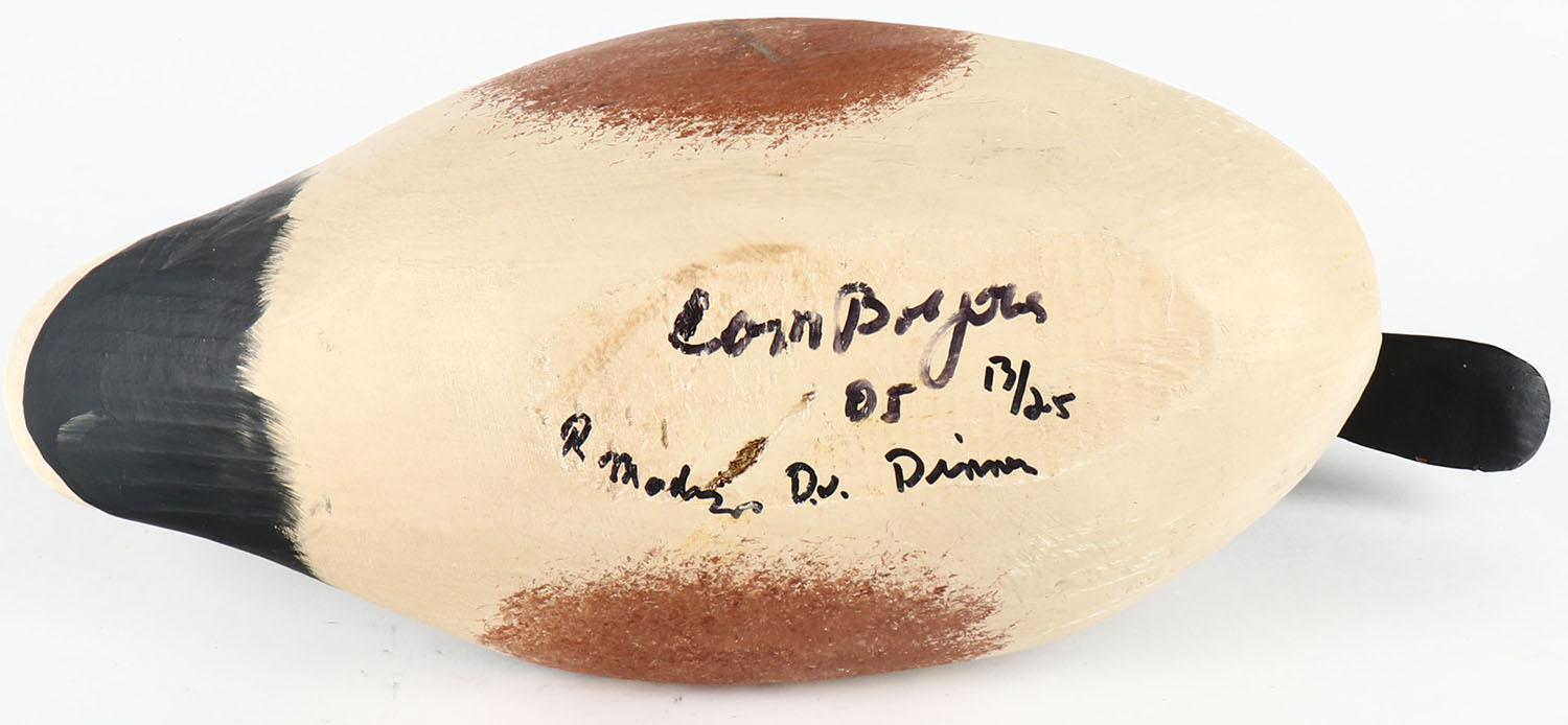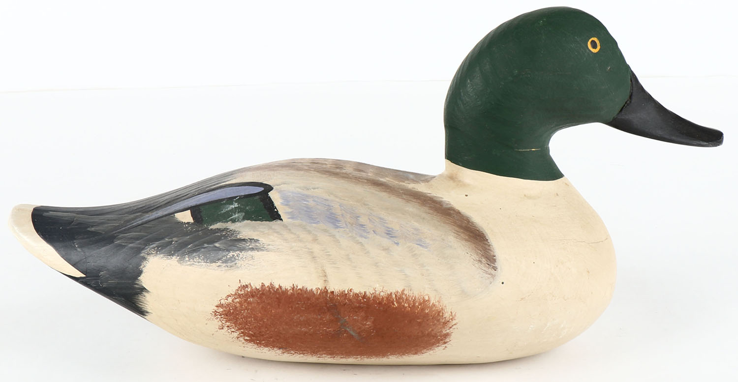 Shoveler Drake by Lorn Bry???, PE, original paint, solid wood, structurally excellent, signed on bottom, 14'' OAL. Grade: Excellent - Value: 30 to 90