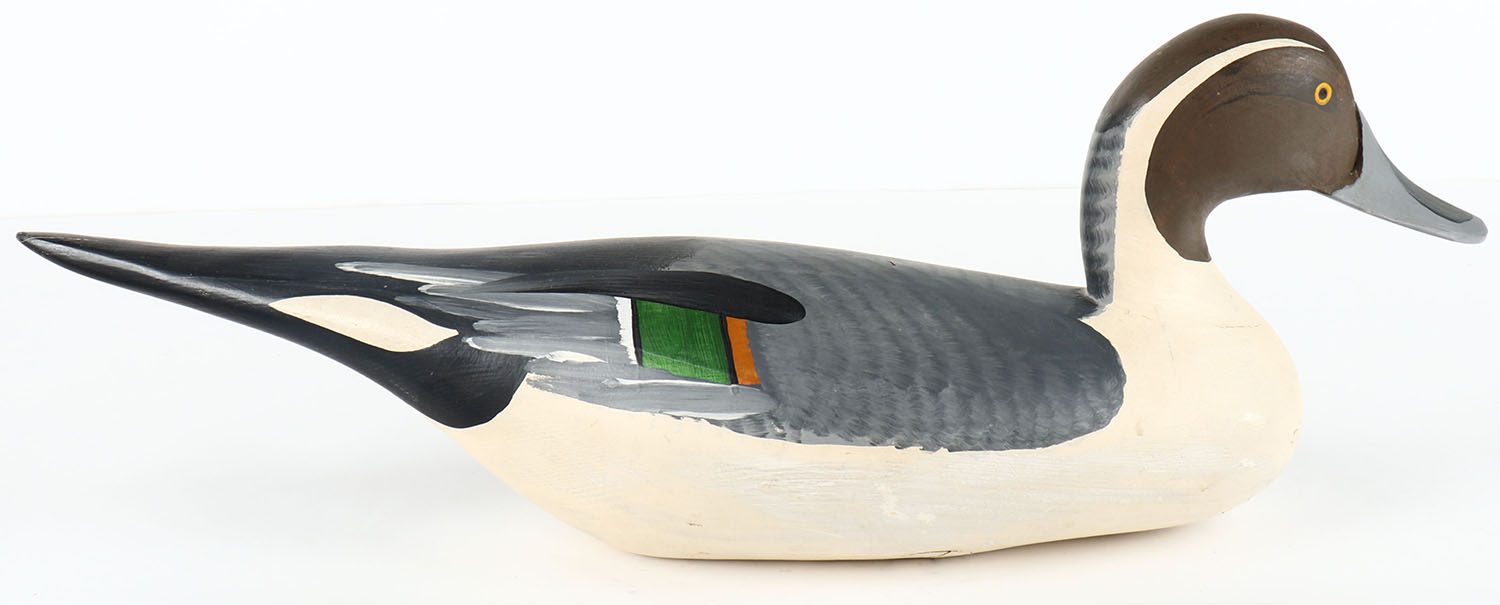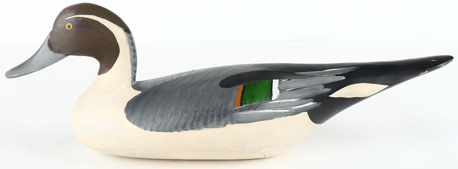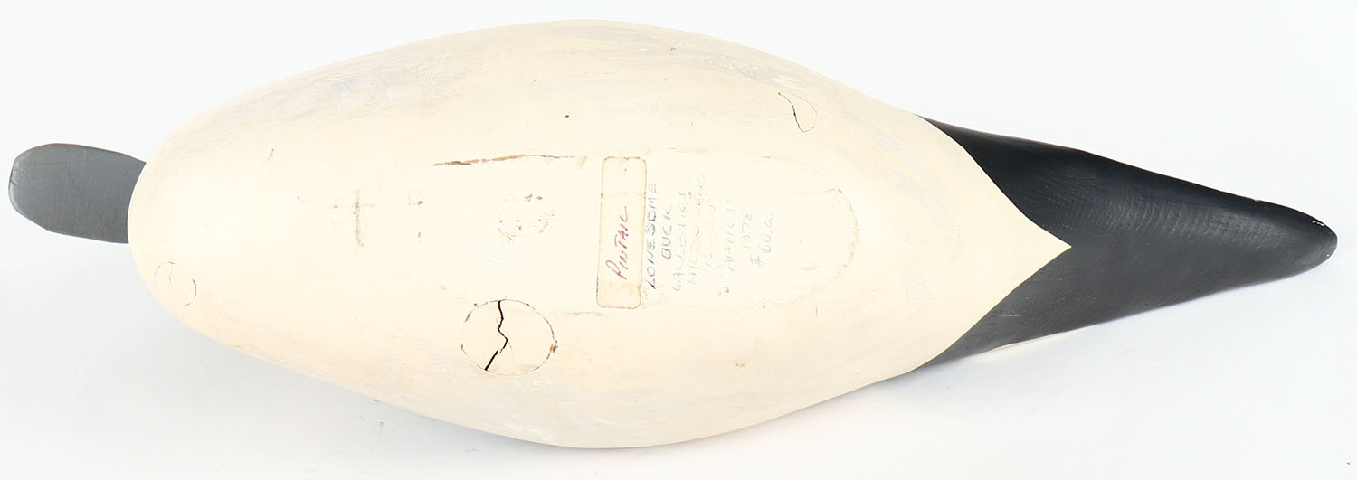 Pintail Drake by unknown maker, marked Lonesome Duck Galleries, Hilton Head island SC, PE, solid wood, original paint, marked on bottom, structurally excellent, 19'' OAL. Grade: Excellent ++ - Value: 60 to 200