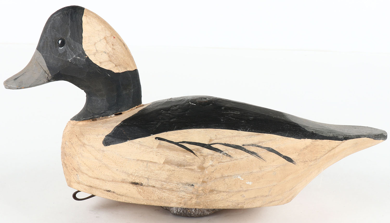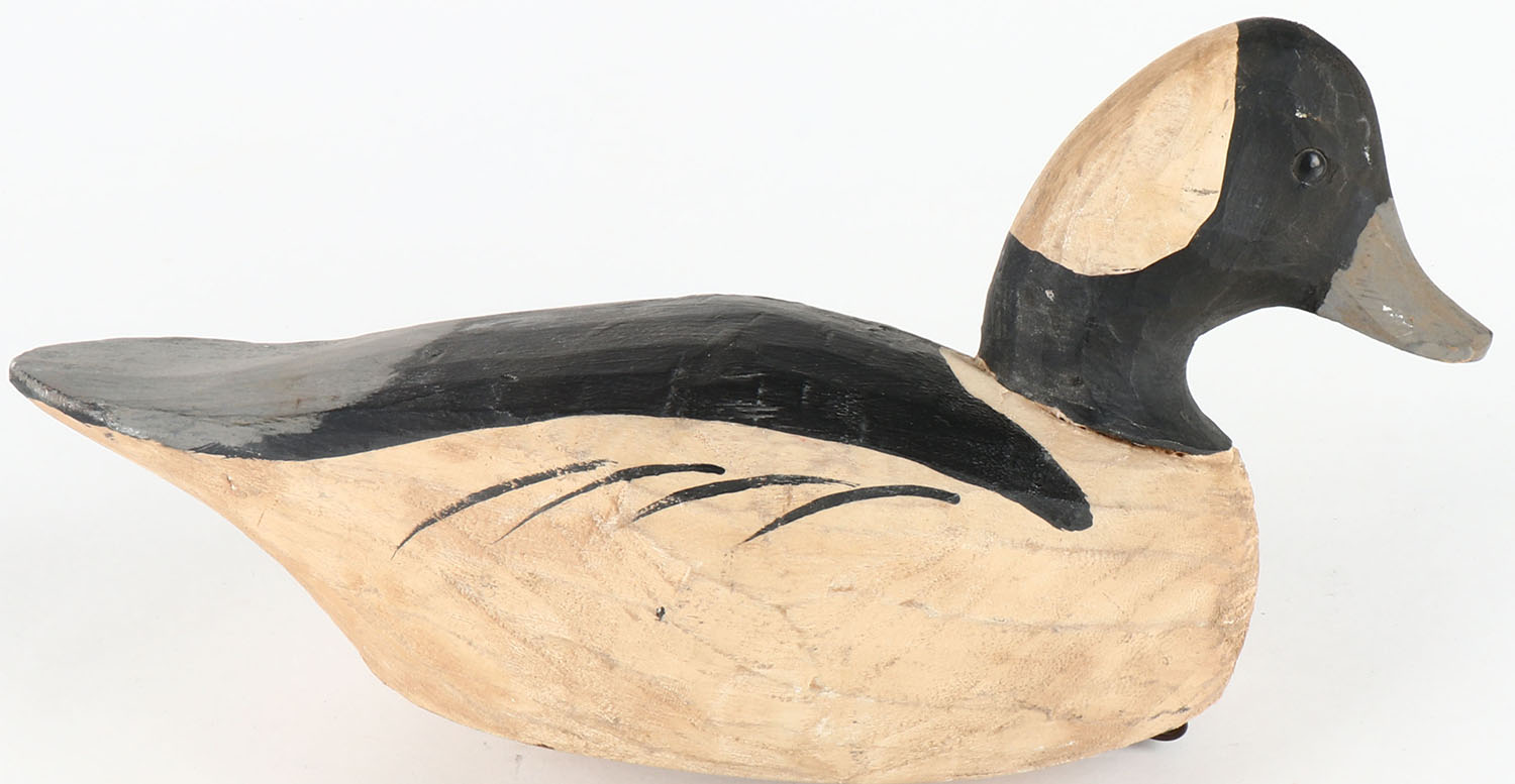 Bufflehead drake by Jimmy Bowden, Chincoteague, VA, glass eyes, solid wood, original paint, structurally excellent, branded on bottom, 12'' OAL. Grade: Excellent + - Value: 50 to 100