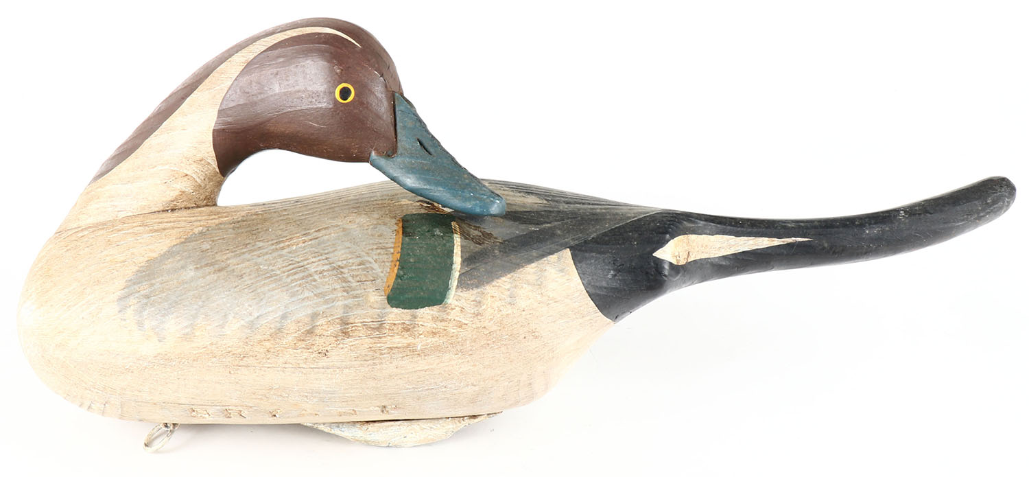 Preening Pintail Drake by Capt. Vernon Bryant, Perryville, MD, painted eyes, solid wood, original paint, structurally excellent, branded BRYANT on bottom. Grade: Excellent + - Value: 30 to 60