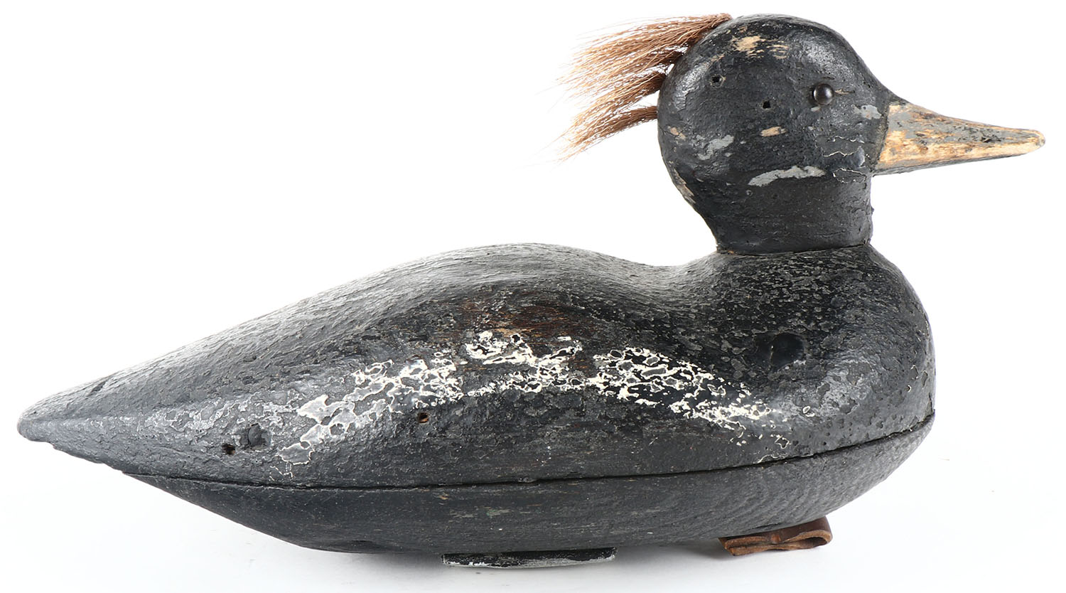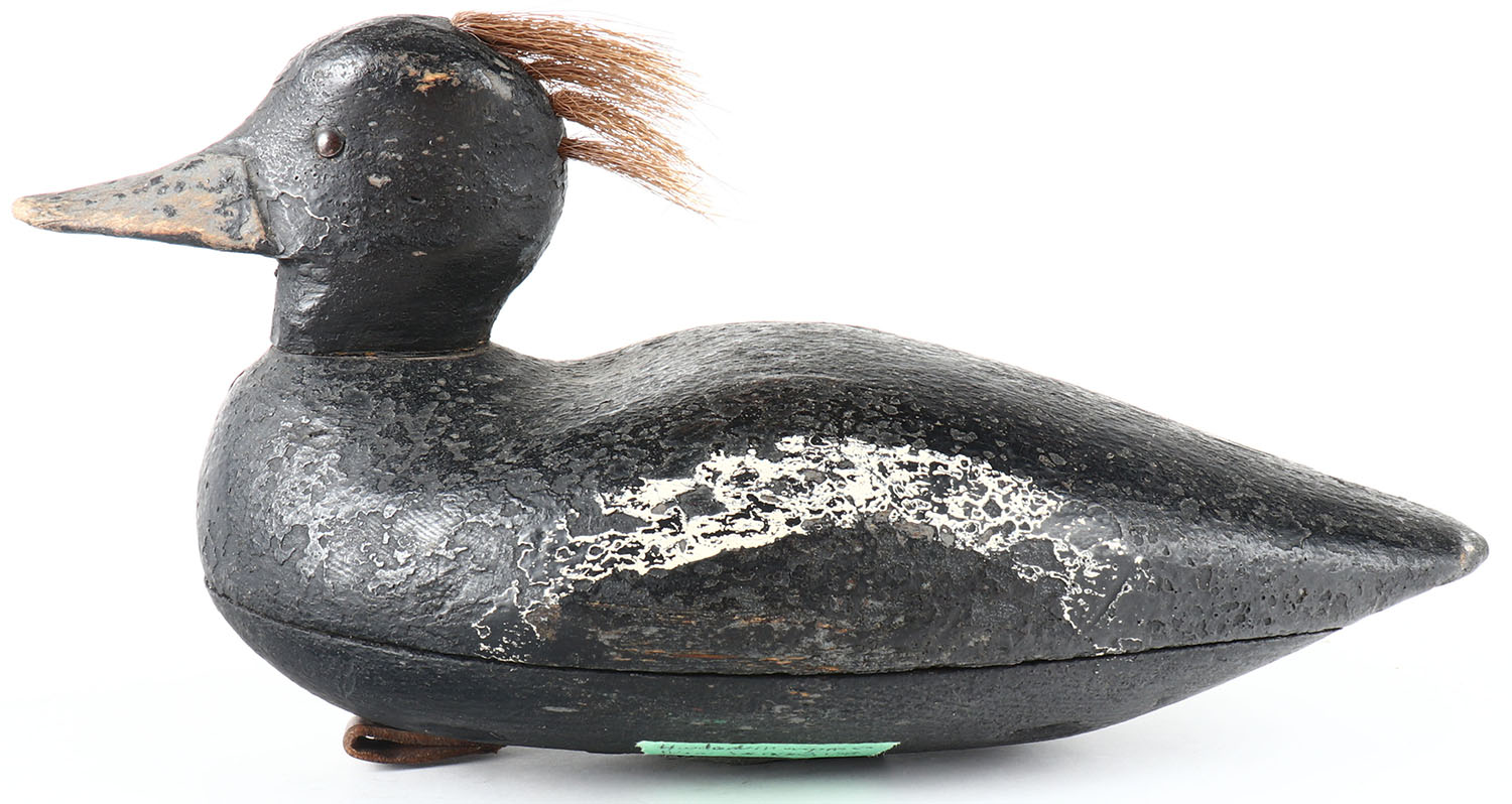 Hooded Merganser by unknown maker, TE, solid wood, very old working repaint, structurally excellent, has natrual hair on back of head, 12'' OAL. Grade: Very Good + - Value: 30 to 60