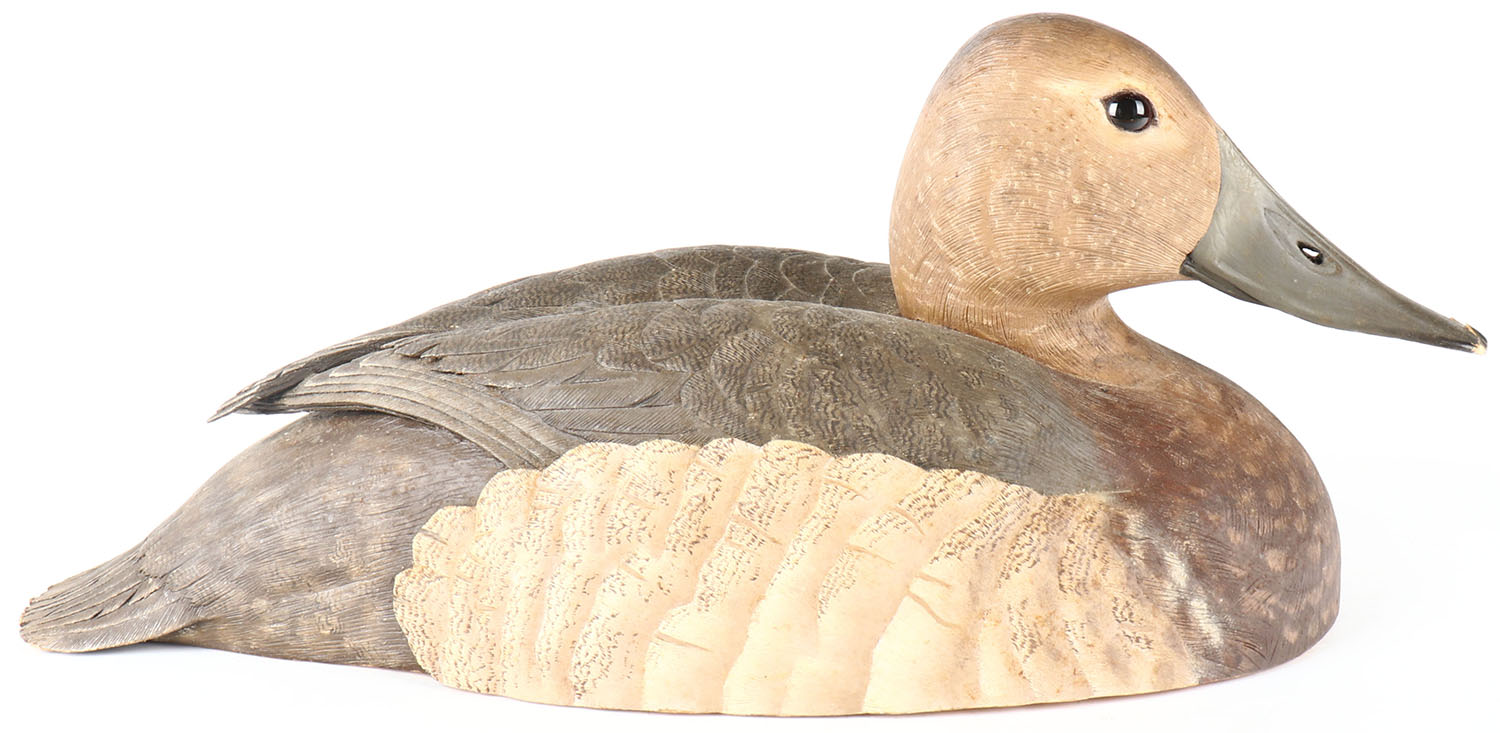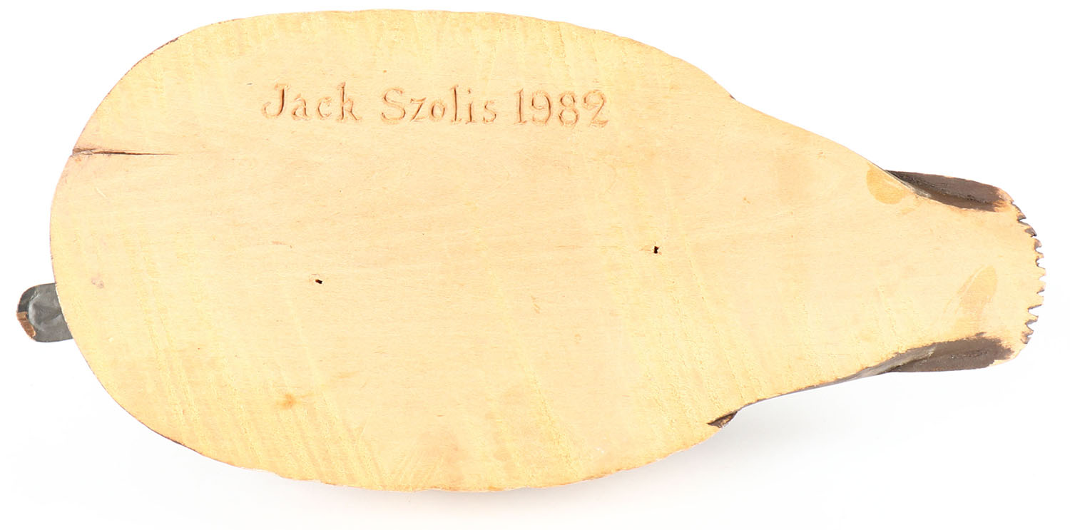 Canvasback Hen by Jack Szolis, glass eyes, solid wood, original paint, structurally excellent, nice wing reflief & feather detail, chip to front bill, signed on bottom, 13'' OAL. Grade: Very Good ++ - Value: 30 to 80